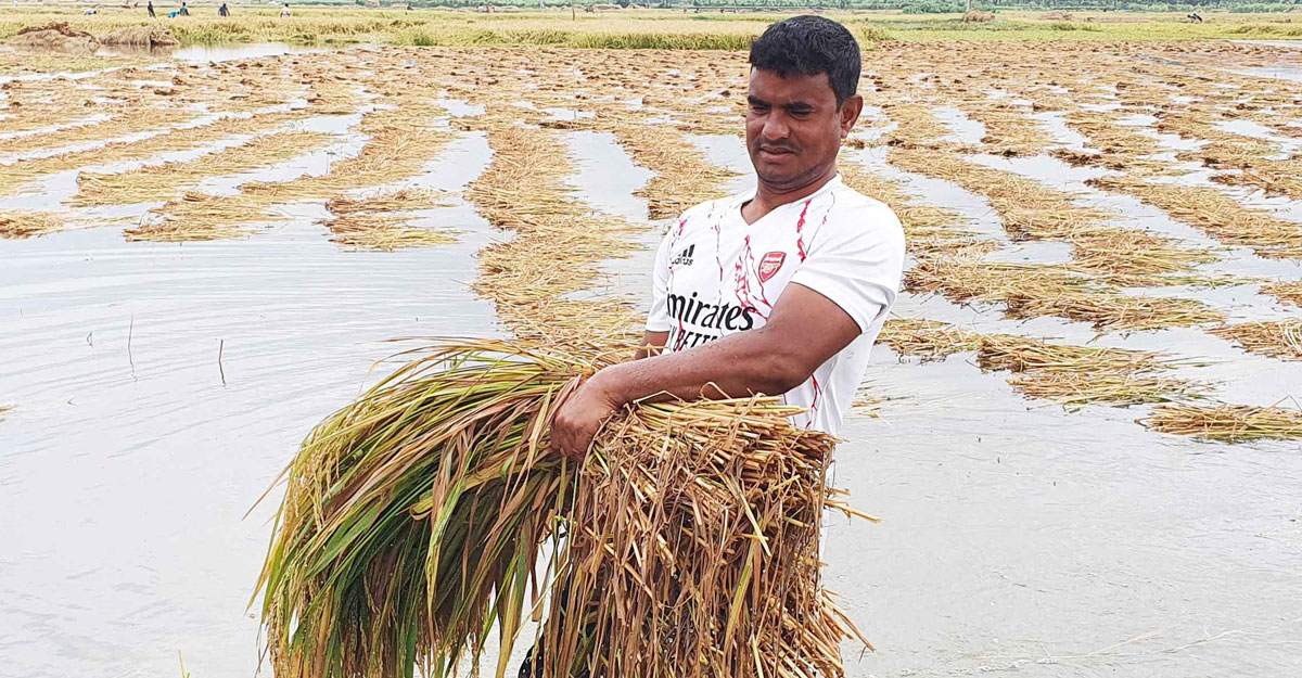 তিনি বলেন, ক্ষেতে কোথাও এক হাত আবার কোথাও প্রায় হাঁটু পানি। ক্ষেতে বিছানো ধানগাছ পচে গেছে। ধানের গাছ থেকে শিষ ভেঙে পড়ছে। পানিতে ভিজে ধানের অঙ্কুরোদগম বের হতে শুরু করেছে। বেশি টাকা দিয়েও কোনো শ্রমিক পাচ্ছি না। খুব ক্ষতির মুখে পড়েছি।