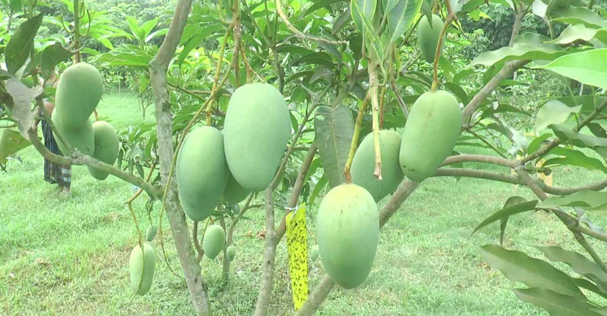 এখন দুই বছর বয়সী প্রতিটি গাছে আম ধরেছে। গাছের ডালে থোকায় থোকায় ঝুলছে আম। একই গাছের বিভিন্ন ডালে পরিপক্ক আমের গুটি ও মুকুল এসেছে।