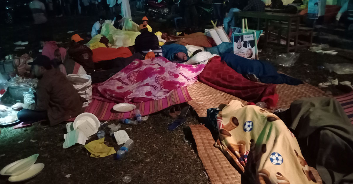 রাত যত গভীর হচ্ছে সঙ্গে শীতও বাড়ছে, তাই সমাবেশস্থল ছাড়ছেন অনেকেই। যারাও রয়েছেন ঘুমানোর জন্য তাদের মধ্যে অনেকেই কিনছেন পাটি। কয়েকজনকে হোগলা (হোগলার পাতা দিয়ে বানানো পাটি) বিছিয়ে শুয়ে থাকতে দেখা যায়। উদ্দেশ্য একটাই শনিবারের (১২ নভেম্বর) গণসমাবেশ সফল করা। ফরিদপুরের বিভাগীয় গণসমাবেশস্থলে এভাবেই রাত কাটাতে দেখা যায় বিএনপি নেতা-কর্মীদের।