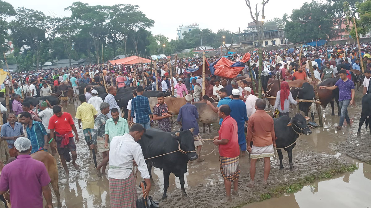 বুধবার (২৮ জুন) দুপুর থেকে বৈরী আবহাওয়ার মধ্যে রংপুর নগরীর ঐতিহ্যবাহী লালবাগ হাট ঘুরে দেখা গেছে হাসিলের নামে ক্রেতা-বিক্রেতাদের পকেট কাটার ফাঁদ। লালবাগ হাট নামে হলেও এবার এই হাট বসেছে পার্শ্ববর্তী কারমাইকেল কলেজের ইন্টারমিডিয়েট (উচ্চমাধ্যমিক) ভবনের সামনে। সেখানে ঝুম বৃষ্টিতে ভিজে কোরবানির গরু-ছাগল বিকিকিনি করতে দূর-দূরান্ত থেকে এসেছেন ক্রেতা-বিক্রেতারা।