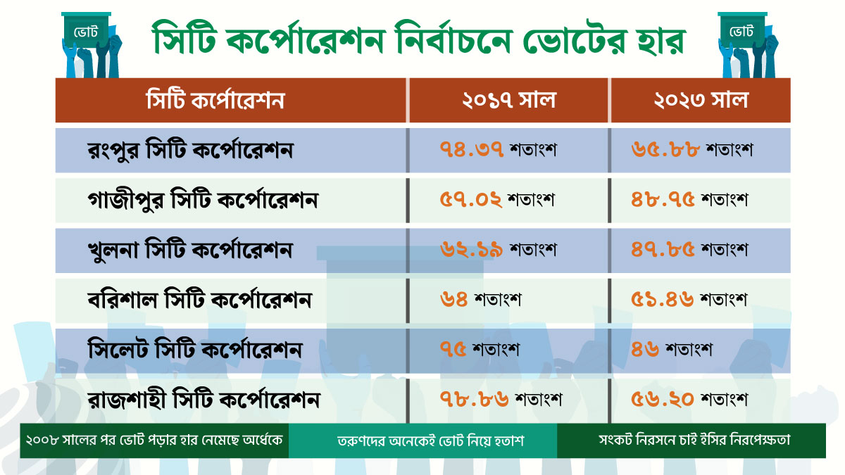 মাহমুদা ও নাছরিনের মতো হাজার হাজার ভোটার এখন ভোটবিমুখ। যার প্রমাণ মিলেছে রংপুর সিটি কর্পোরেশন নির্বাচনে। ২০২২ সালের ২৭ ডিসেম্বর অনুষ্ঠিত এ নির্বাচনে ভোটার উপস্থিতি আশানুরূপ ছিল না। ওই সিটি নির্বাচনে ভোট পড়েছে ৬৫ দশমিক ৮৮ শতাংশ।