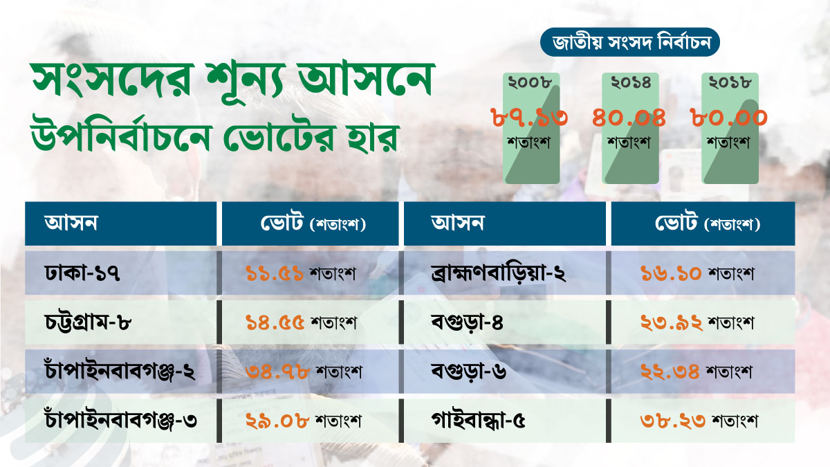 সর্বশেষ গত ১৭ জুলাই অনুষ্ঠিত ঢাকা-১৭ আসনের উপনির্বাচনে ভোটার উপস্থিতির দিকে তাকালে উদ্বেগের বিষয়টি আরও বেশি স্পষ্ট হবে। ঢাকা-১৭ আসনের উপনির্বাচনে ভোটের হার নেমে দাঁড়িয়েছে ১১.৫১ শতাংশে। আর চট্টগ্রাম-৮ আসনে ভোটের হার ছিল ১৪.৫৫ শতাংশ। তারও আগে বিএনপির ছেড়ে দেওয়া চাঁপাইনবাবগঞ্জ-২ ও ৩, ব্রাহ্মণবাড়িয়া-২, ঠাকুরগাঁও-৩, বগুড়া-৪ ও ৬ আসনের উপনির্বাচনেও ভোটার উপস্থিতি ছিল হতাশাজনক। ওই ছয়টির মধ্যে ব্রাহ্মণবাড়িয়া-২ উপনির্বাচনে সবচেয়ে কম ভোট পড়ে। সেখানে ভোটের হার ছিল ১৬.১ শতাংশ।