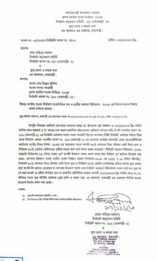 রবিবার (১৭ ডিসেম্বর) দুপুরে রাজবাড়ী-২ আসনের নির্বাচনী অনুসন্ধান কমিটির চেয়ারম্যান ও যুগ্ম জেলা ও দায়রা জজ-২ আদালতের বিচারক শাহিনুর রহমান এ শোকজ নোটিশ দেন।