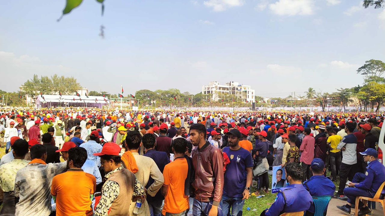 জনসভা মঞ্চে ওঠার সঙ্গে সঙ্গে নেতাকর্মীরা তাদেরকে স্লোগান ও অভিবাদন বার্তায় বরণ করে নেন। ইতোমধ্যে বঙ্গবন্ধু উদ্যান কানায় কানায় পূর্ণ হয়ে গেছে। জনসভায় বিভাগের নেতৃবৃন্দ, আওয়ামী লীগের মনোনীত প্রার্থীরাসহ কেন্দ্রীয় নেতৃবৃন্দ বক্তব্য দিচ্ছেন।