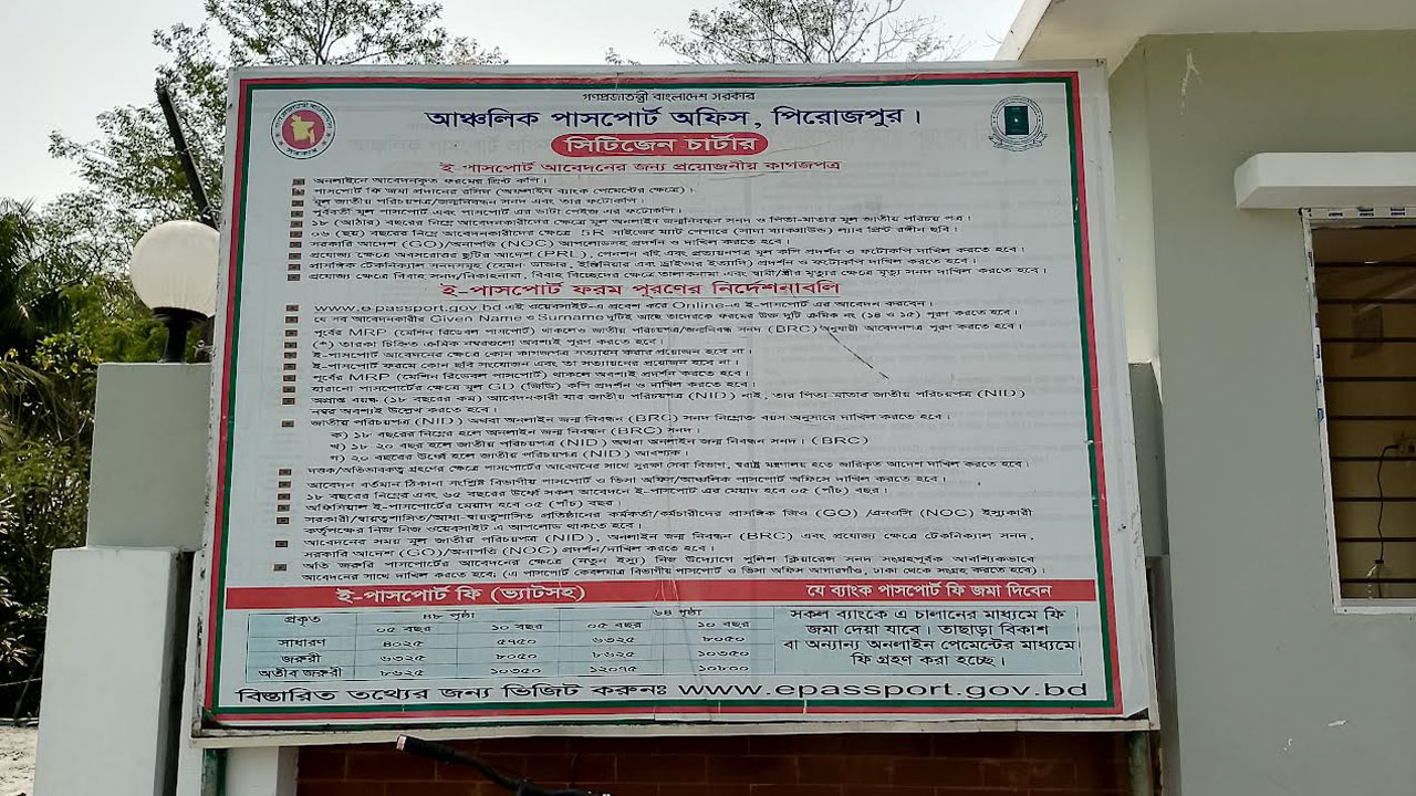 পিরোজপুর আঞ্চলিক পাসপোর্ট অফিসে দালাল ছাড়া সেবা পাওয়া কঠিন হয়ে পড়েছে। সেবাপ্রার্থীদের অভিযোগ, নিজেরা পাসপোর্টের আবেদন করলে নানাভাবে হয়রানি করা হয়। কিন্তু দালালের শরণাপন্ন হলেই সব কাজ দ্রুত হয়ে যায়, লাগে না পুলিশ ভেরিফিকেশনও। এ জন্য অবশ্য গুনতে হয় অতিরিক্ত তিন থেকে চার হাজার টাকা। আবার কখনো দায়িত্বরত আনসার সদস্যরাও সেবাপ্রার্থীদের পাঠিয়ে দেন দালালদের কাছে।