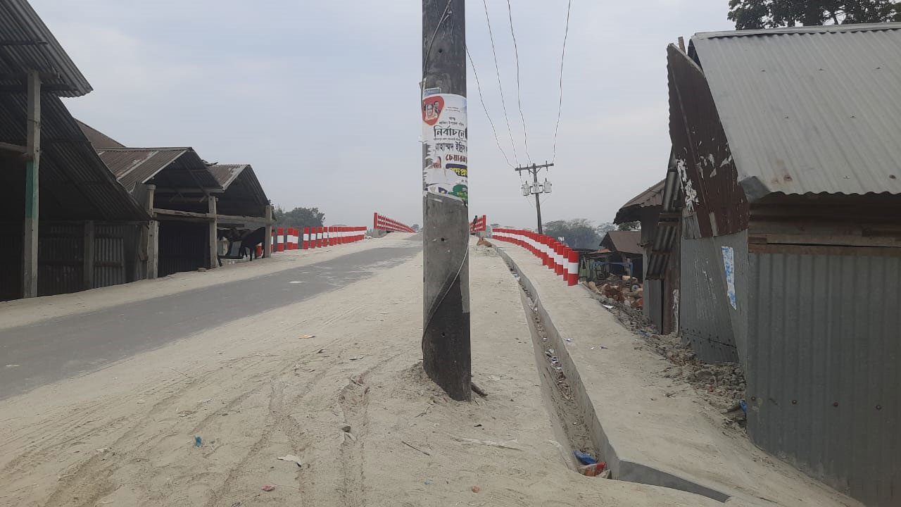 রাস্তার মাঝে বৈদ্যুতিক খুঁটি রেখেই কাজ সম্পন্ন, দুর্ঘটনার আশঙ্কা