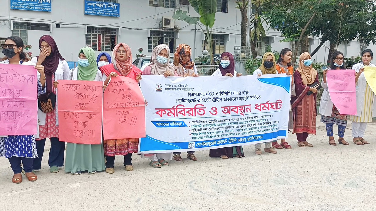 পোস্ট গ্র্যাজুয়েট প্রাইভেট ট্রেইনি ডা. নুসরাত সুলতানা বলেন, আমাদের কিছু দাবি দাওয়া আগে থেকেই ছিল। সেগুলো পূরণের জন্য রাস্তায় দাঁড়িয়েছি। আমরা বাধ্য হয়েই দাঁড়িয়েছি। সংশ্লিষ্ট সবার সঙ্গেই আমরা কথা বলেছিলাম কিন্তু যখন আমরা দেখলাম যে আমাদের ন্যূনতম যে দাবিগুলো আছে সেগুলোও পূরণ হচ্ছে না তখন আমরা রাস্তায় নামতে বাধ্য হয়েছি। ডাক্তার সমাজ কখনোই চাইবে না যে তাদের চিকিৎসা সেবা না দিয়ে রাস্তায় দাঁড়িয়ে আন্দোলন করতে। কিন্তু আমরা আজ আমাদের পেটের দায়ে বাধ্য হয়েছি। বর্তমান দ্রব্যমূল্যের সঙ্গে আমাদের দেওয়া স্যালারি কিছুই না।