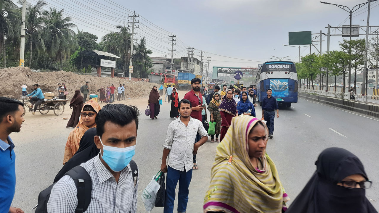 সোমবার (৮ এপ্রিল) দুপুরে ঢাকা-আরিচা মহাসড়কের সাভারের আমিনবাজার, হেমায়েতপুর, উলাইল, গেন্ডা, থানাস্ট্যান্ড, বাজার বাসস্ট্যান্ড, রেডিও কলোনি ও নবীনগর-চন্দ্রা মহাসড়কের বাইপাইল, ইপিজেড, জিরানি, শ্রীপুর ও আশুলিয়া ঘুরে এ চিত্র দেখা যায়।