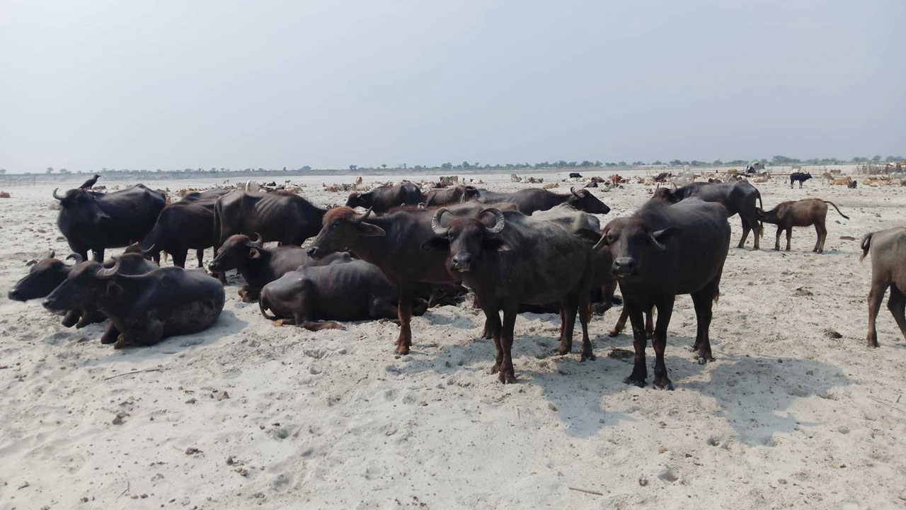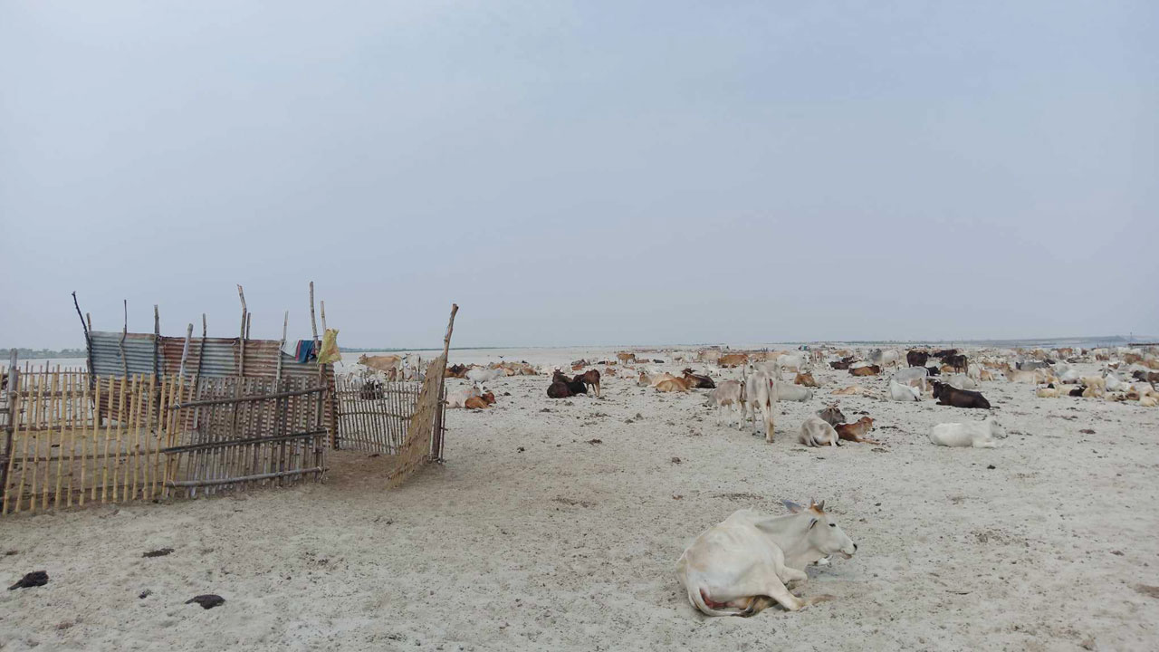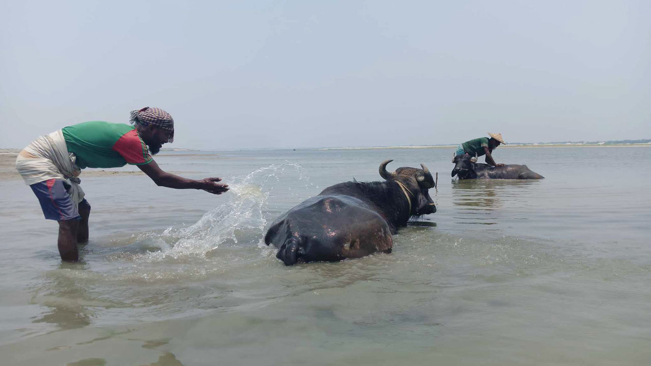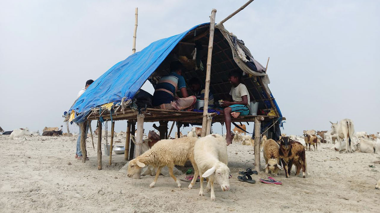তবে কখনো কখনো নৌকায় নদীতে কয়েকজন মানুষকে দেখা যাচ্ছে। পদ্মা নদীর বুকে ছাতি ফাটানো রোদেও লোকগুলোর কোনো ভ্রূক্ষেপ নেই, একমনে নিজেদের কাজ করে যাচ্ছেন। তবে রাখালদের মাথার ওপর ছাতা, হাতে বড় লাঠি, ঘাড়ে গামছা, বগলে দুই লিটারের একটা পানির বোতল। তাদের মুখে ‘ওই যা যা, ঘুর ঘুর’ চলে অবিরাম।