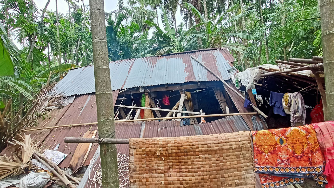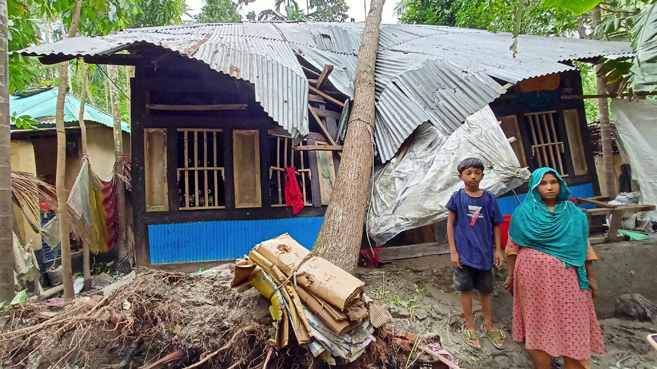 শুক্রবার (৩১ মে) দেলোয়ার শেখের বাড়িতে গিয়ে দেখা যায়, ঝড়ের আঘাতে ভেঙে পড়া গাছ তার ঘরটিকে দুমড়ে মুচড়ে দিয়েছে। জোয়ারের পানিতে ভেসে গেছে মাটির তৈরি মেঝে। রান্না করার মাটির চুলা ভেঙে গেছে জোয়ারের পানিতে। বাড়ির পেছনে ইট দিয়ে চুলা তৈরি করে সেখানে রান্না করছেন দেলোয়ার শেখের স্ত্রী লিপি বেগম।