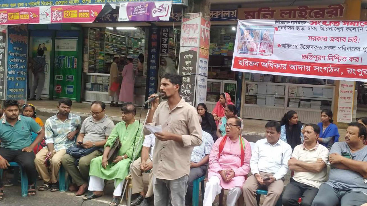 ঢাকার মিরনজিল্লা কলোনি থেকে হরিজন সম্প্রদায়ের লোকজনদের উচ্ছেদের প্রতিবাদে রংপুরে সংহতি সমাবেশ অনুষ্ঠিত হয়েছে। সমাবেশ থেকে অবিলম্বে উচ্ছেদের শিকার সকল পরিবারের পুনর্বাসন ও ক্ষতিপূরণ নিশ্চিত করার দাবি জানানো হয়। একইসঙ্গে উচ্ছেদের মদদদাতাসহ জড়িতদের আইনের আওতায় এনে শাস্তির দাবি জানেয়েছেন সমাবেশে অংশ নেওয়া বিভিন্ন সংগঠনের নেতারা।