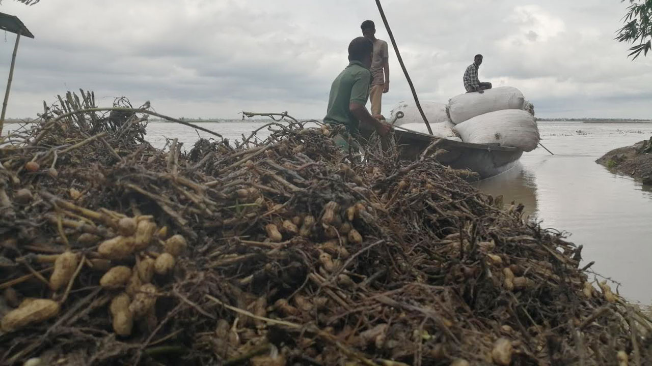 বৃহস্পতিবার (২০ জুন) বিকেলে সরেজমিনে উপজেলার গাবুড়া ও শিবদেব চর এলাকায় গিয়ে দেখা যায়, নৌকা দিয়ে হাঁটু পানি থেকে বাদাম তুলছেন কৃষকরা। যে বাদাম এখন তোলা হচ্ছে তার আংশিক অপরিপক্ব। তবে পানির নিচে থাকায় পচন ধরার শঙ্কা প্রকাশ করেছেন বাদামচাষিরা।