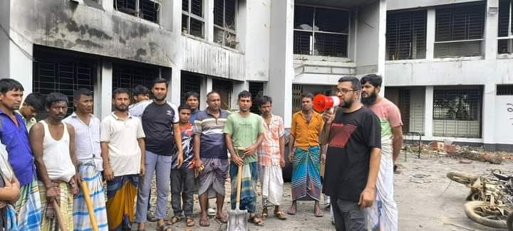 কর্মীদের নিয়ে থানার ধ্বংসস্তূপ সরালেন বিএনপি নেতা