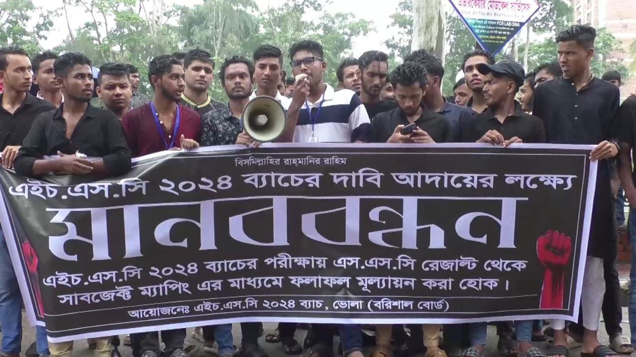 এদিকে সকাল ১০টার দিকে ভোলা প্রেস ক্লাব চত্বরে মানববন্ধন করে পরীক্ষা বাতিল করে মূল্যায়ন পদ্ধতিতে ফলাফল প্রকাশের দাবি জানান পরীক্ষার্থীরা। তারা বলেন, বৈষম্যবিরোধী ছাত্র আন্দোলনের কারণে অনেক শিক্ষার্থী আন্দোলনে জড়িয়ে লেখাপড়া করতে পারেননি। অনেকে আহত হয়েছেন। এই অবস্থায় লেখাপড়ায় ফেরা কষ্টকর। সার্বিক পরিস্থিতি বিবেচনায় পরীক্ষার্থীদের অটো পাস এবং এসএসসি রেজাল্ট থেকে সাবজেক্ট ম্যাপিং করে ফলাফল ঘোষণার দাবি জানান তারা। এতে জেলার বিভিন্ন কলেজের পরীক্ষার্থীরা অংশ নেন।