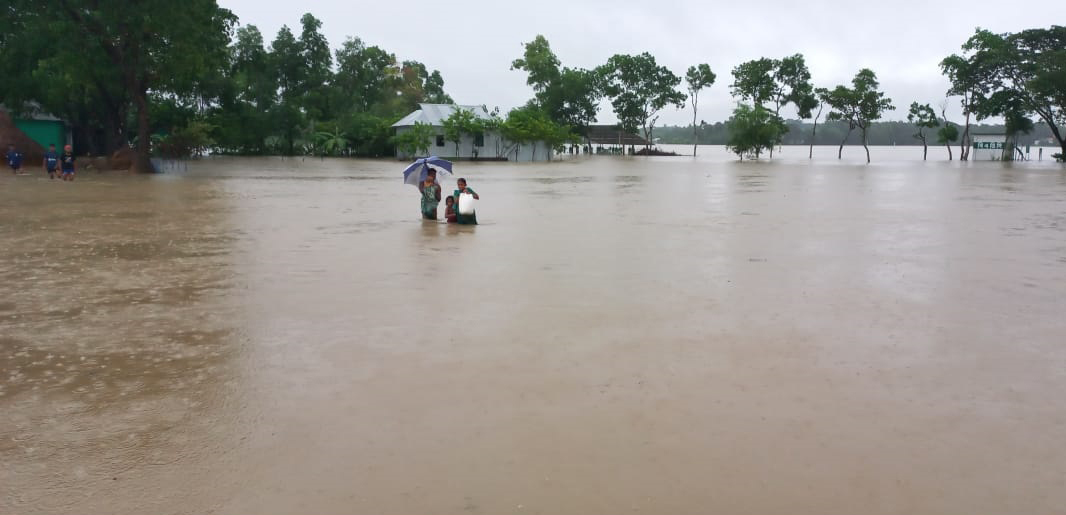 এর আগে, খলাপাড়া এলাকায় হাওড়া নদীর বাঁধের কিছু অংশ ভেঙে পানি ঢুকতে শুরু করে। সেই থেকে বাউতলা, বীরচন্দ্রপুর, কালিকাপুর, বঙ্গেরচর, সাহেবনগরসহ ৩৪টি গ্রামে পানি ঢোকে। এতে ঘরবন্দি হয়েছে সেইসব গ্রামের ৩৪টি গ্রামের ৫২০টি পরিবার।