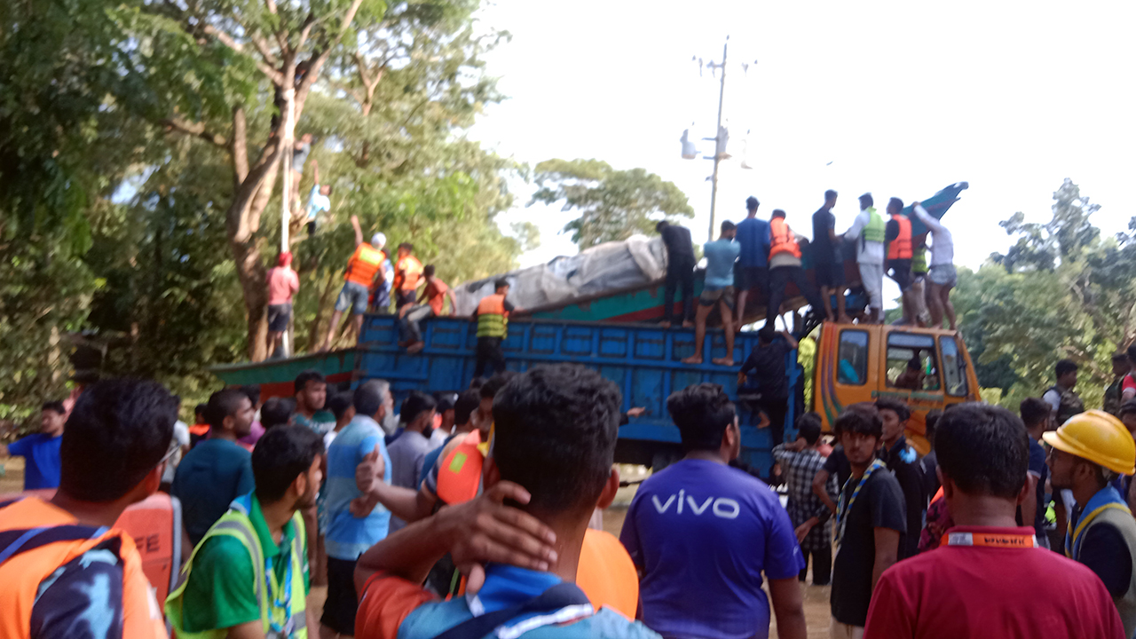 সেখানে উপস্থিত সেনাবাহিনীর একটি দল এবং ফায়ার সার্ভিসের একটি দল দূর-দূরান্ত থেকে আসা এসব স্বেচ্ছাসেবীদের পথ দেখিয়ে বিভিন্ন দুর্গম এলাকার দিকে পাঠাচ্ছেন পানিতে আটকা মানুষদের উদ্ধার এবং ত্রাণ সামগ্রী বিতরণের জন্য।