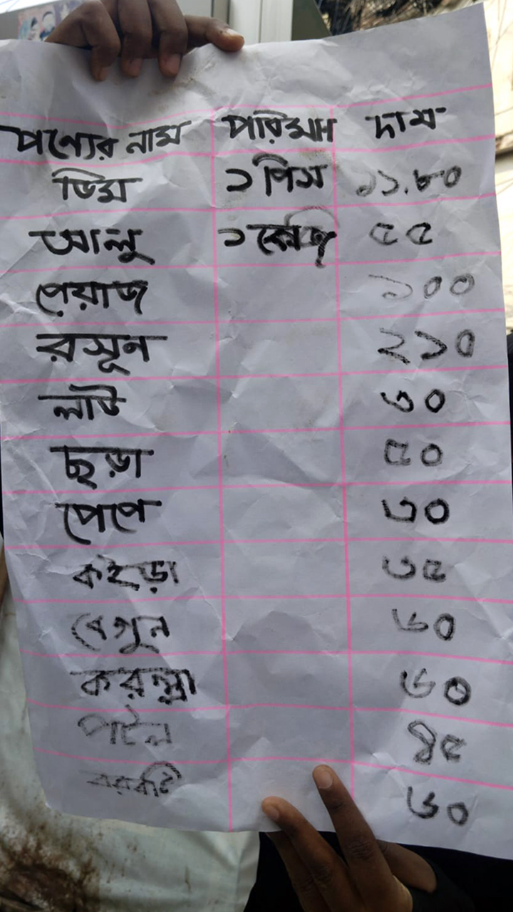 নিত্যপ্রয়োজনীয় পণ্যের মধ্যে প্রতিটি ডিম বিক্রি হচ্ছে ১১ টাকা ৮০ পয়সা, আলু কেজি প্রতি ৫৫ টাকা, পেঁয়াজ ১০০ টাকা, রসুন ২১০ টাকা, মাঝারি লাউ ৩০ টাকা, কচুর ছড়া ৫০ টাকা, পেঁপে ৩০ টাকা, বেগুন ৬০ টাকা, করলা ৬০ টাকা, পটল ৪৫ টাকা কেজি দরে বিক্রি করা হচ্ছে।