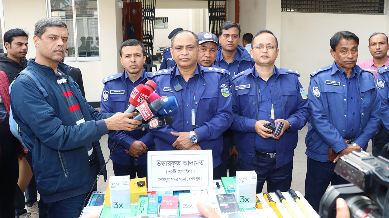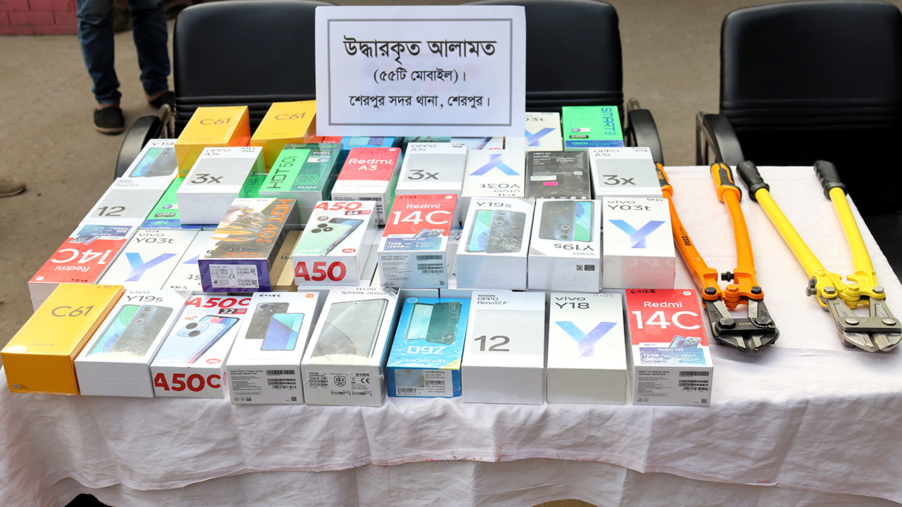 শেরপুর জেলা শহরের রঘুনাথ বাজারের কোরাইশী কমপ্লেক্সে মোবাইল ফোনের দোকানে চুরি করে পালানোর সময় আন্তঃজেলা চোর চক্রের ১০ সদস্যকে আটক করেছে পুলিশ। এ সময় তাদের কাছ থেকে তিনটি ব্যাগে রাখা ৫৫টি নতুন অ্যান্ড্রয়েড মোবাইল ফোন উদ্ধার করা হয়েছে।