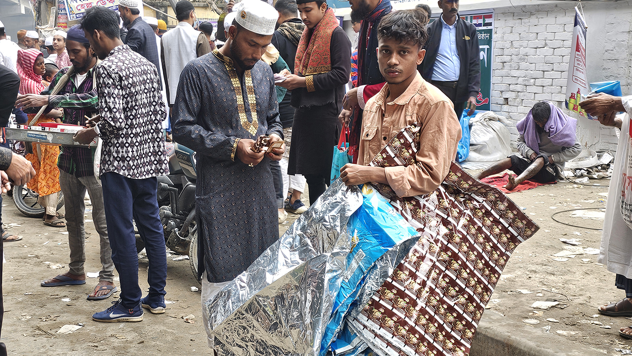 বিশ্ব ইজতেমার ৭নং গেটের সামনে নামাজের জন্য অব্যবহৃত কাগজ বিক্রি করছিলেন মেহেদী হাসান। মেহেদী বলেন, অন্যান্য সময় তিনি একটি ওয়ার্কশপে শ্রমিকের কাজ করেন। ইজতেমার সময় তিনি কাগজ পলি বিক্রি করেন।