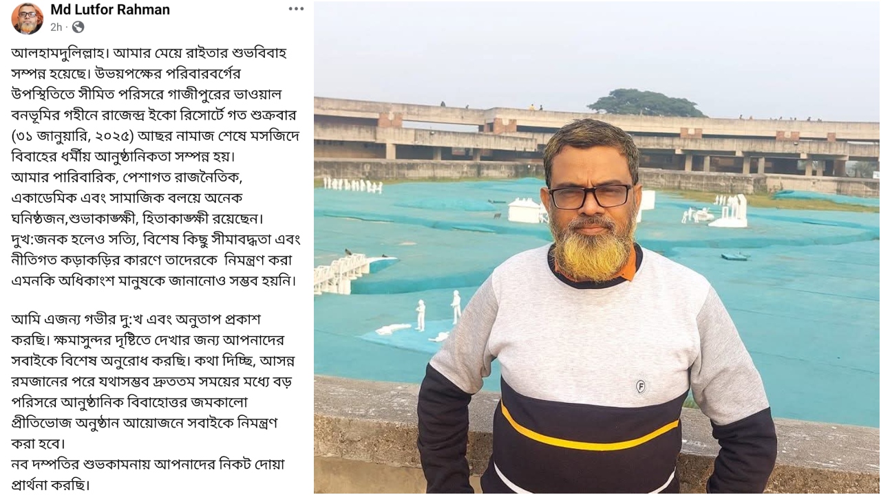 তিনি দুঃখ প্রকাশ করে আরও লিখেন, আমি এ জন্য গভীর দুঃখ এবং অনুতাপ প্রকাশ করছি। ক্ষমাসুন্দর দৃষ্টিতে দেখার জন্য আপনাদের সবাইকে বিশেষ অনুরোধ করছি। কথা দিচ্ছি, আসন্ন রমজানের পরে যথাসম্ভব দ্রুততম সময়ের মধ্যে বড় পরিসরে আনুষ্ঠানিক বিবাহোত্তর জমকালো প্রীতিভোজ অনুষ্ঠান আয়োজনে সবাইকে নিমন্ত্রণ করা হবে। নব দম্পতির শুভকামনায় আপনাদের নিকট দোয়া প্রার্থনা করছি।