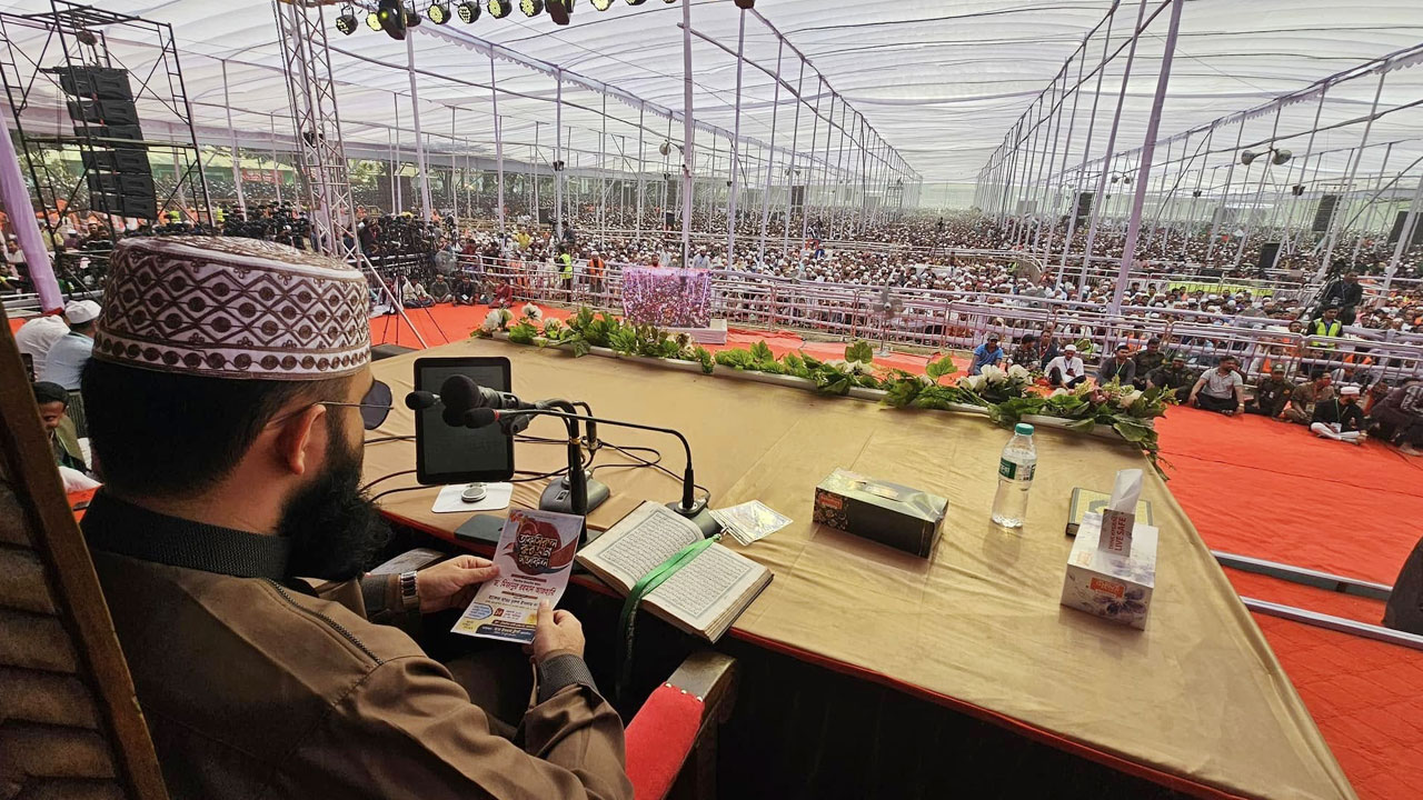 এরপর মিজানুর রহমান আজহারী দুপুর সোয়া ২টার দিকে শুভেচ্ছা বিনিময় শেষে দুই হাত উঁচিয়ে উপস্থিতি লাখ লাখ জনতাকে শুভেচ্ছা জানিয়ে বয়ান শুরু করে বলেন, আজকে এই মঞ্চে বিএনপির প্রিন্স ভাই জেলা বিএনপির পুরো টিম নিয়ে এসেছেন। জামায়াতের আকন্দ (মতিউর রহমান) ভাই এসেছেন। বৈষম্য বিরোধীরাও এসেছে। এতে বুঝা যায় পুরো বাংলাদেশ আজকের এই মঞ্চে। এটা অনেক সুন্দর।