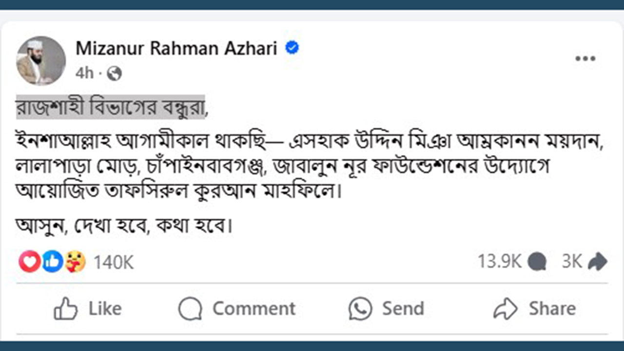 ফেসবুক পোস্টে তিনি লিখেছেন, ‘রাজশাহী বিভাগের বন্ধুরা, ইনশাআল্লাহ আগামীকাল থাকছি—এসহাক উদ্দিন মিঞা আম্রকানন ময়দান, লালাপাড়া মোড়, চাঁপাইনবাবগঞ্জ, জাবালুন নূর ফাউন্ডেশনের উদ্যোগে আয়োজিত তাফসিরুল কুরআন মাহফিলে। আসুন, দেখা হবে, কথা হবে।’