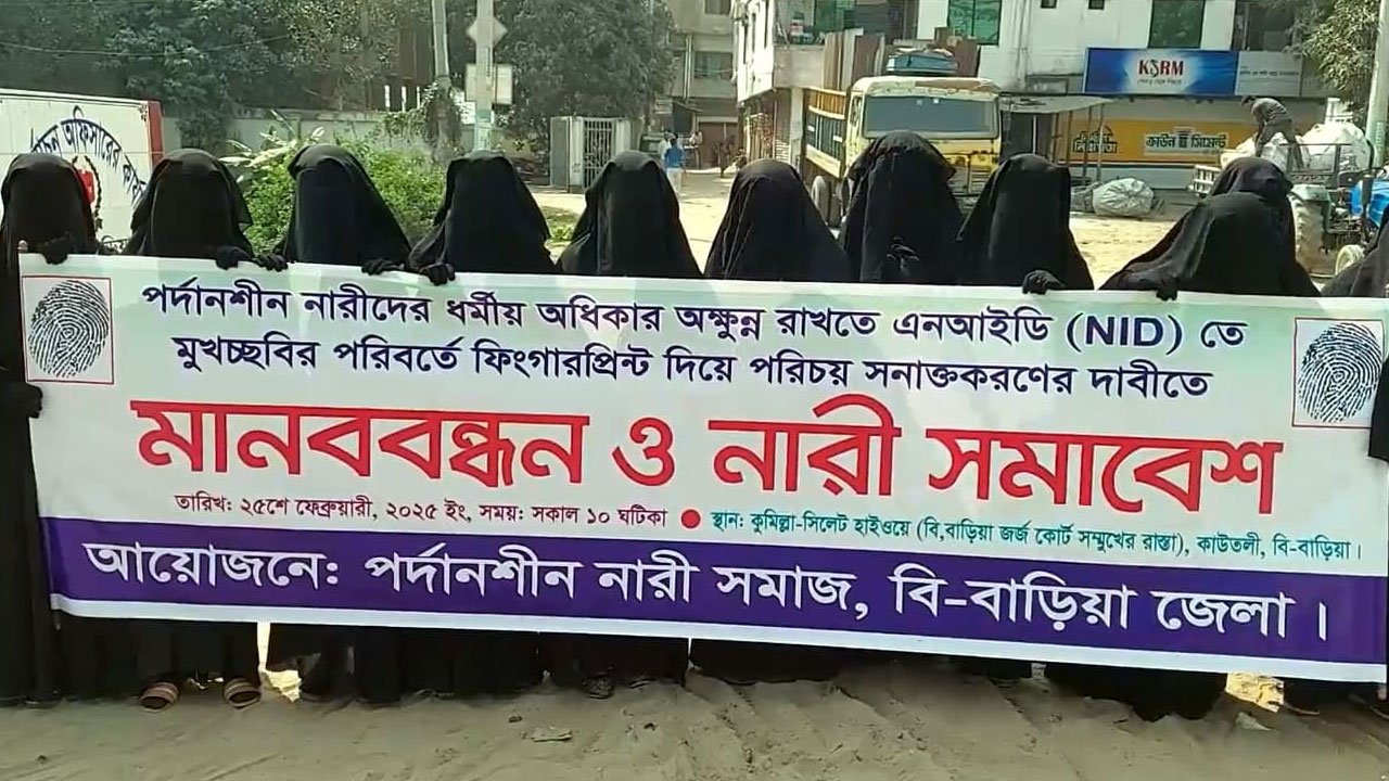 ফিঙ্গারপ্রিন্ট নিয়ে পরিচয় যাচাইসহ ছবিহীন এনআইডি কার্ড প্রদানের দাবিতে ব্রাহ্মণবাড়িয়ায় মানববন্ধন করেছেন পর্দানশিন নারীরা। এছাড়া তারা জেলা নির্বাচন কর্মকর্তা ও জেলা শিক্ষা কর্মকর্তার কাছে স্মারকলিপি দিয়েছেন। স্মারকলিপিতে তারা তিন দফা দাবি তুলে ধরেন।