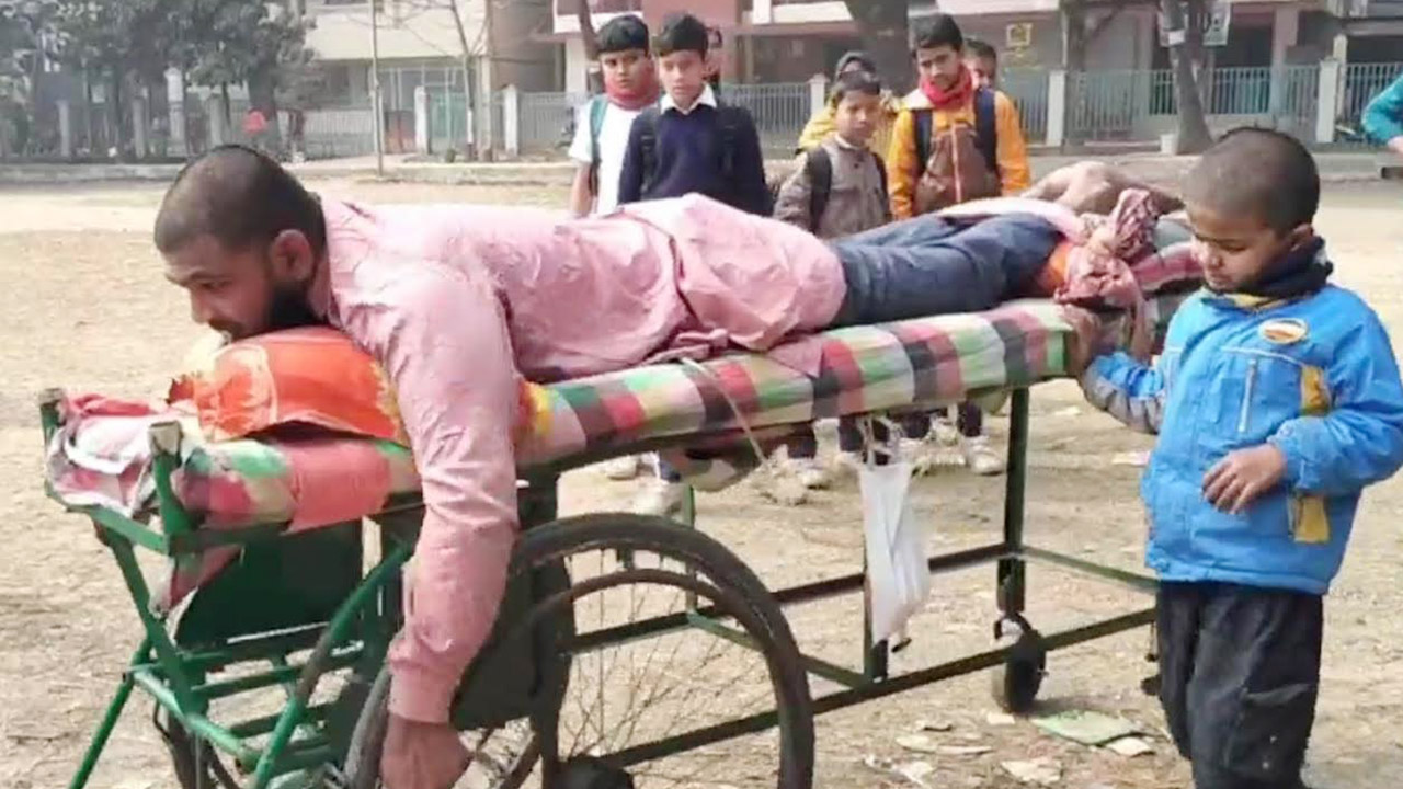 ঠাকুরগাঁওয়ের পীরগঞ্জ পৌর এলাকার জগথা গ্রামের বাসিন্দা আইনুল হকের ছেলে (৩৩) জসীম উদ্দিন। পাঁচ বছর আগে কুলির কাজ করতে গিয়ে শরীরের ওপর আলুর বস্তা পড়ে যায়। এতে মেরুদণ্ড ভেঙে যায়। তাৎক্ষণিকভাবে প্রাথমিক চিকিৎসা নিলেও অর্থের অভাবে উন্নত চিকিৎসাও করাতে পারেননি। এরপর থেকে দুই চাকার একটি ঠেলাগাড়িতে শুয়ে-বসেই দিন কাটে জসীমের। তার এই দুঃসময়ে আত্মীয়স্বজনেরা পাশে না থাকায় শক্ত হাতে বাবার হাত ধরে শিশুসন্তান মিম ও আলিফ। মূলত তাদের ওপর ভর করেই জসীম উদ্দিন চলাফেরা করেন।