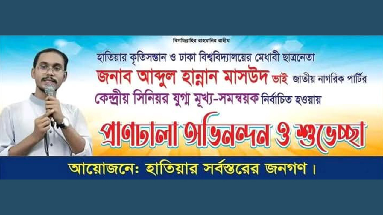 নতুন রাজনৈতিক দল জাতীয় নাগরিক পার্টির (এনসিপি) সিনিয়র যুগ্ম মুখ্য সমন্বয়ক হয়েছেন নোয়াখালীর দ্বীপ উপজেলা হাতিয়ার সন্তান আবদুল হান্নান মাসউদ। এতে খুশি হয়ে তার বাবা মাওলানা আবদুল মালেক আনন্দ মিছিল করেছেন। মাসউদ এর আগে বৈষম্যবিরোধী ছাত্র আন্দোলনের মুখ্য সংগঠক হিসেবে দায়িত্ব পালন করেছেন।