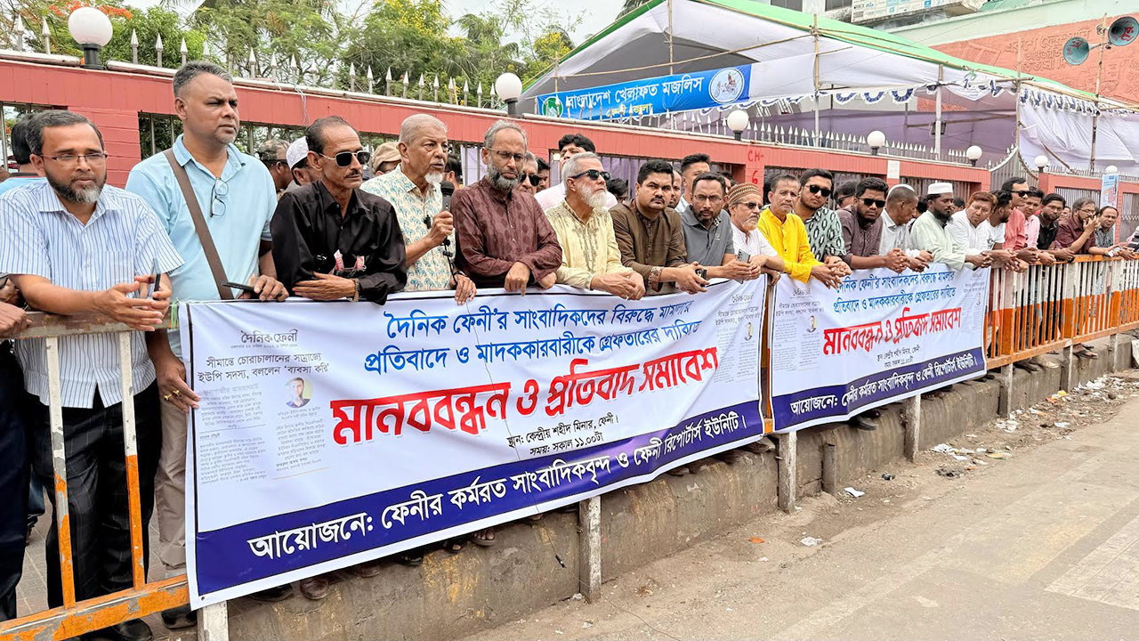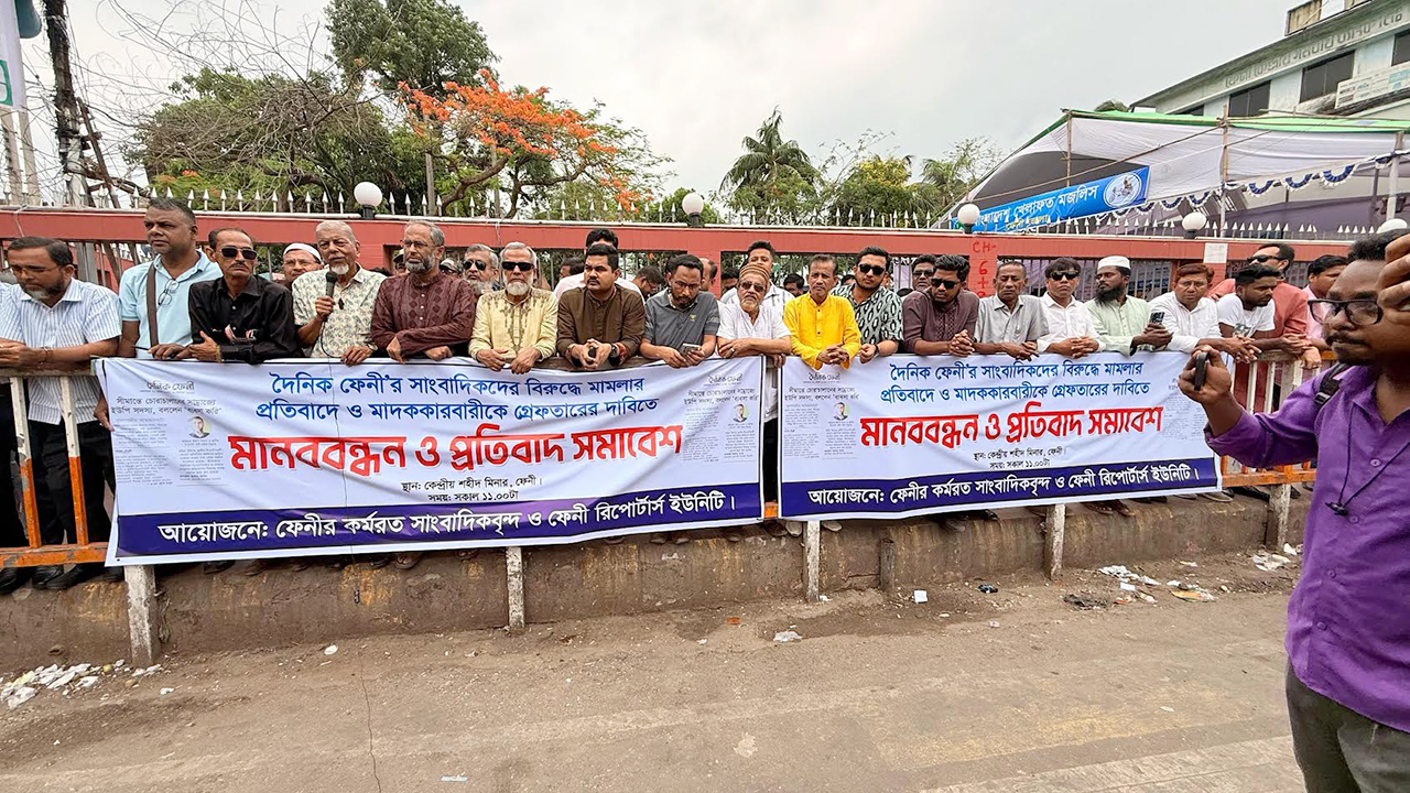 বৃহস্পতিবার (২৪ এপ্রিল) বেলা সোয়া ১১টার দিকে শহরের কেন্দ্রীয় শহীদ মিনার প্রাঙ্গণে অনুষ্ঠিত মানববন্ধন সমাবেশ থেকে এ আহ্বান জানানো হয়। ফেনীতে কর্মরত সাংবাদিক ও ফেনী রিপোর্টার্স ইউনিটির ব্যানারে আয়োজিত এই কর্মসূচিতে বিভিন্ন সাংবাদিক সংগঠনের নেতাসহ বিভিন্ন প্রিন্ট, ইলেকট্রনিক ও অনলাইন নিউজ পোর্টালে কর্মরত সাংবাদিকরা অংশ নেন।