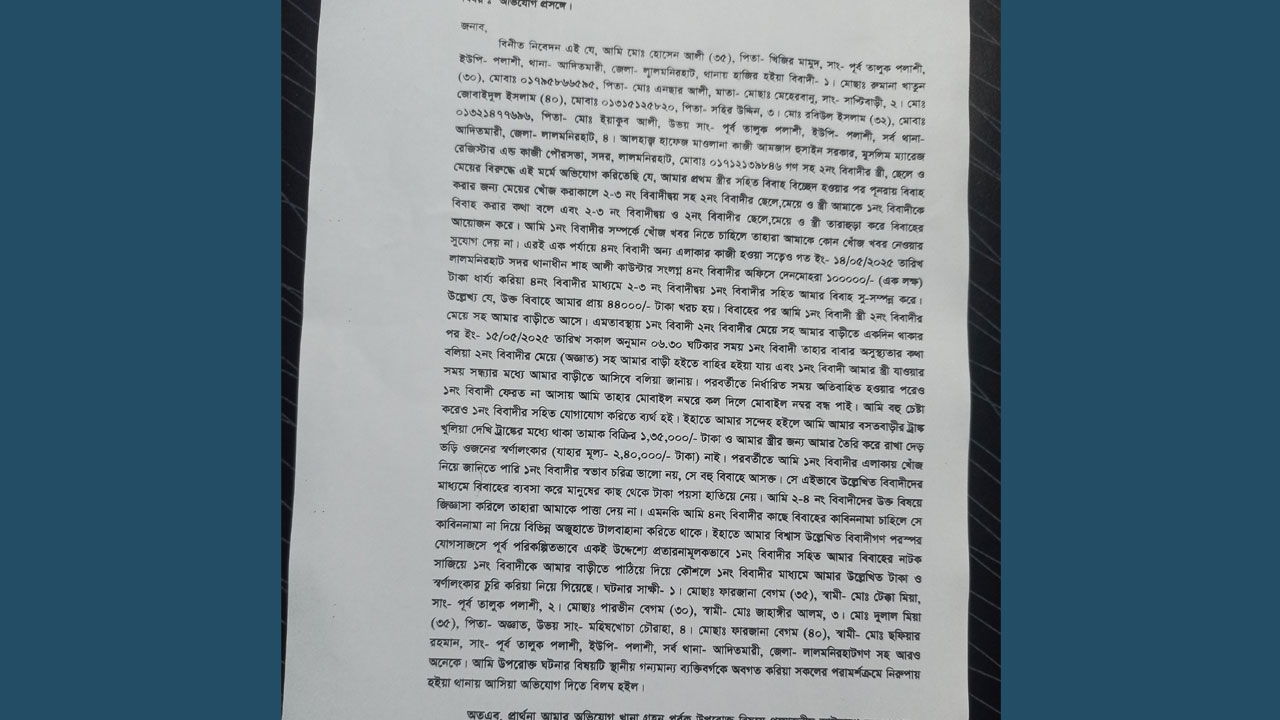 রাতে বিয়ে করে সকাল হতেই স্বামীর বাড়ির নগদ টাকা স্বর্ণালংকার চুরি করে পালিয়েছেন নববধূ ও তার খালাত বোন। এ ঘটনায় তাদের বিরুদ্ধে লিখিত অভিযোগ দায়ের করেছেন ভুক্তভোগী স্বামী হোসেন আলী। শুক্রবার (১৬ মে) বিকেলে লালমনিরহাটের আদিতমারী থানায় এ লিখিত অভিযোগ করেন তিনি।