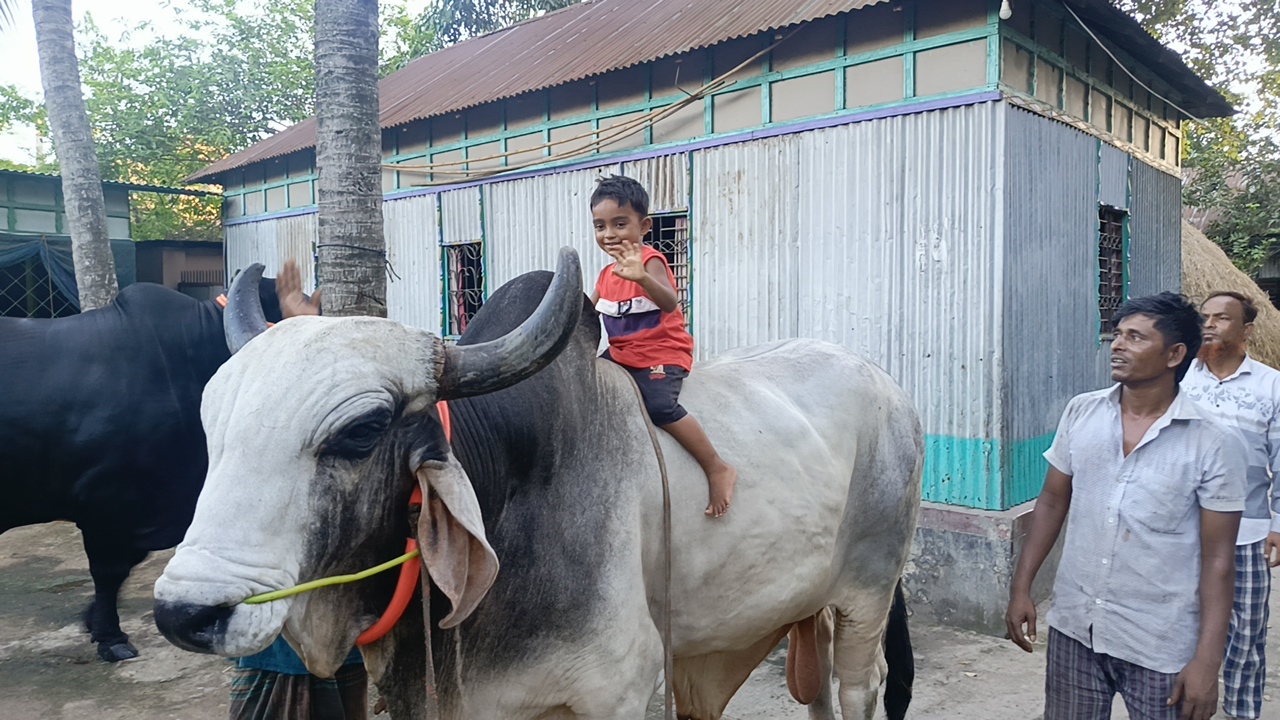 এমন চিত্র দেখা যায়, ব্রাহ্মণবাড়িয়ার সদর উপজেলার নরসিংসার ইউনিয়নের পয়াগ গ্রামে। শিশু সুলাইমানের সঙ্গী এই বিশাল ষাঁড়টি নেপালি গির জাতের।