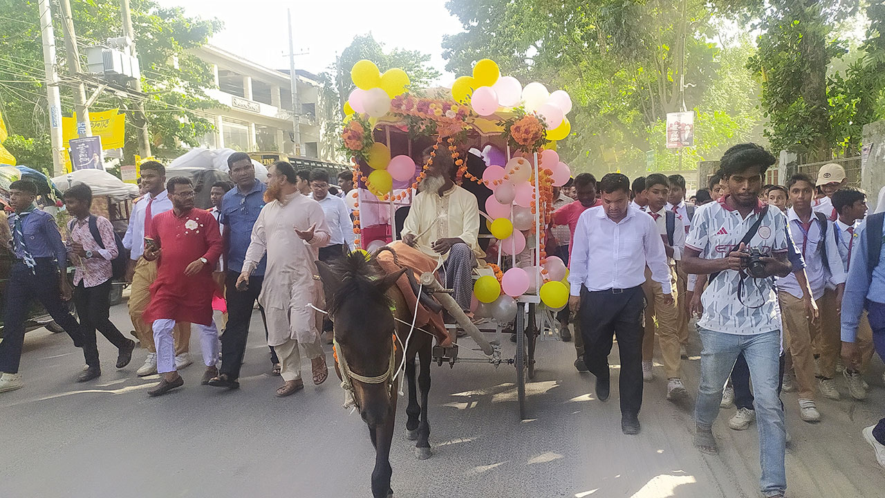 পঞ্চগড়ে চাকরি জীবনের শেষদিনে এক প্রধান শিক্ষককে রাজকীয় বিদায় দিয়েছেন সহকর্মী ও শিক্ষার্থীরা। ফুলসজ্জিত একটি ঘোড়ার গাড়িতে করে তাকে বাড়ি পৌঁছে দেওয়া হয়েছে।