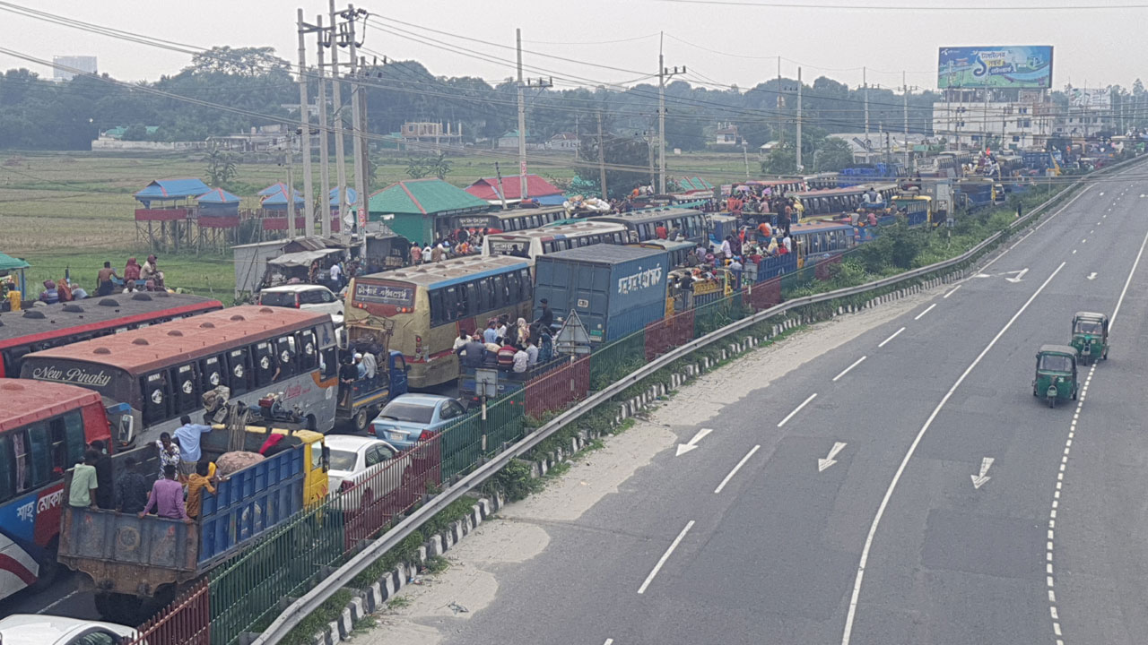 এলেঙ্গা বাস স্টেশন, রাবনা বাইপাস, আশেকপুর বাইপাস ঘুরে দেখা যায়, মহাসড়কে মানুষের ঢল নেমেছে। যাত্রীবাহী বাস ছাড়াও ট্রাক, পিকআপ, বিভিন্ন সড়কের লোকাল বাস, লেগুনায় যাত্রী পরিবহন করা হচ্ছে। মহাসড়কে বাসের চেয়ে ট্রাক ও পিকআপ বেশি দেখা যাচ্ছে। এ ছাড়া বাড়তি ভাড়া দিতে হচ্ছে যাত্রীদের। গণপরিবহন সংকট ও অতিরিক্ত ভাড়ার কারণে অনেকেই জীবনের ঝুঁকি নিয়ে খোলা ট্রাক-পিকআপ ও বাসের ছাদে গন্তব্যে যাচ্ছেন।