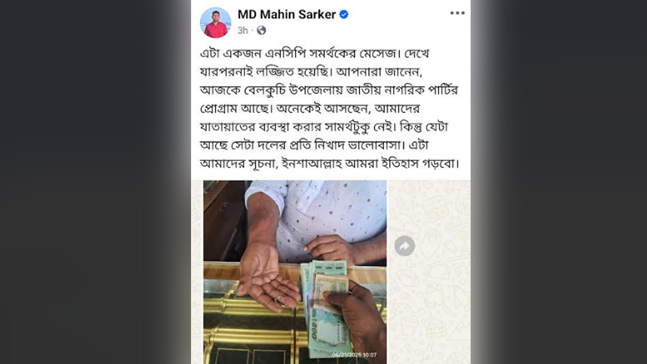 শনিবার (২১ জুন) বেলা ১১টায় জাতীয় নাগরিক পার্টির (এনসিপি) এর যুগ্ম সদস্য সচিব মো. মাহিন সরকার এক ফেসবুক পোস্টে বিষয়টি জানান। সেই পোস্টে দেখা যায়, একজন এনসিপি সমর্থক মাহিন সরকারের ব্যক্তিগত হোয়াটসঅ্যাপে একটি ছবি দিয়ে লিখেছেন, ‘লিডার, বউয়ের গয়না বিক্রি করলাম। প্রোগ্রামের পোলাপানের খরচের জন্য।’ জবাবে মাহিন সরকার লিখেন, ‘কি বলেন? ওটা ফেরত নেন। আমি ম্যানেজ করব, এখনই ফেরত নেন।’