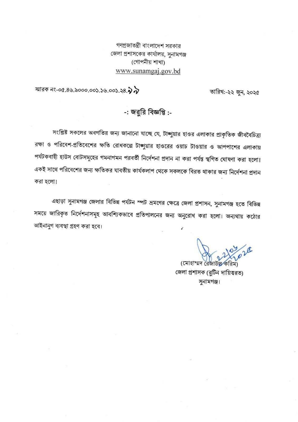 এই নির্দেশনা জারি করেছেন সুনামগঞ্জের জেলা প্রশাসক (রুটিন দায়িত্বপ্রাপ্ত) মোহাম্মদ রেজাউল করিম।