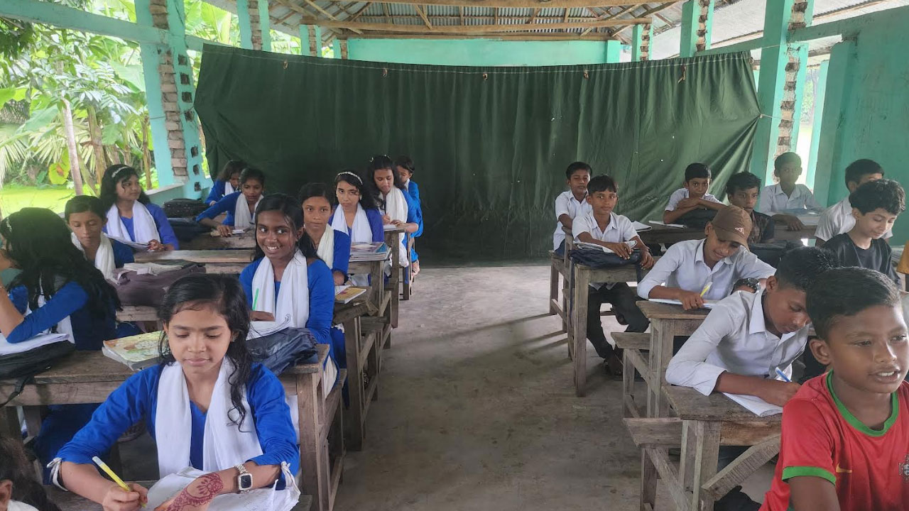 বৃষ্টি হলেই কাঁপে শিক্ষার্থীদের বুক, টিনশেড ঘরে পর্দা টানিয়ে চলে পাঠদান