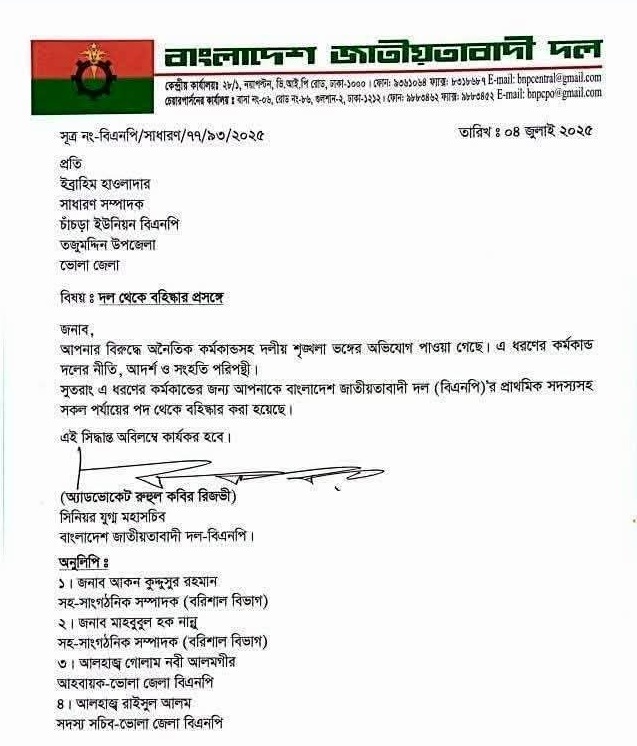 চিঠিতে বলা হয়েছে, ইব্রাহিম হাওলাদারের বিরুদ্ধে অনৈতিক কর্মকাণ্ডসহ দলীয় শৃঙ্খলা ভঙ্গের অভিযোগ পাওয়া গেছে। এ ধরনের কর্মকাণ্ড দলের নীতি, আদর্শ ও সংহতি পরিপন্থি। সুতরাং, এসব কর্মকাণ্ডের জন্য তাকে বিএনপি প্রাথমিক সদস্য পদসহ সকল পর্যায়ের পদ থেকে বহিষ্কার করা হয়েছে।