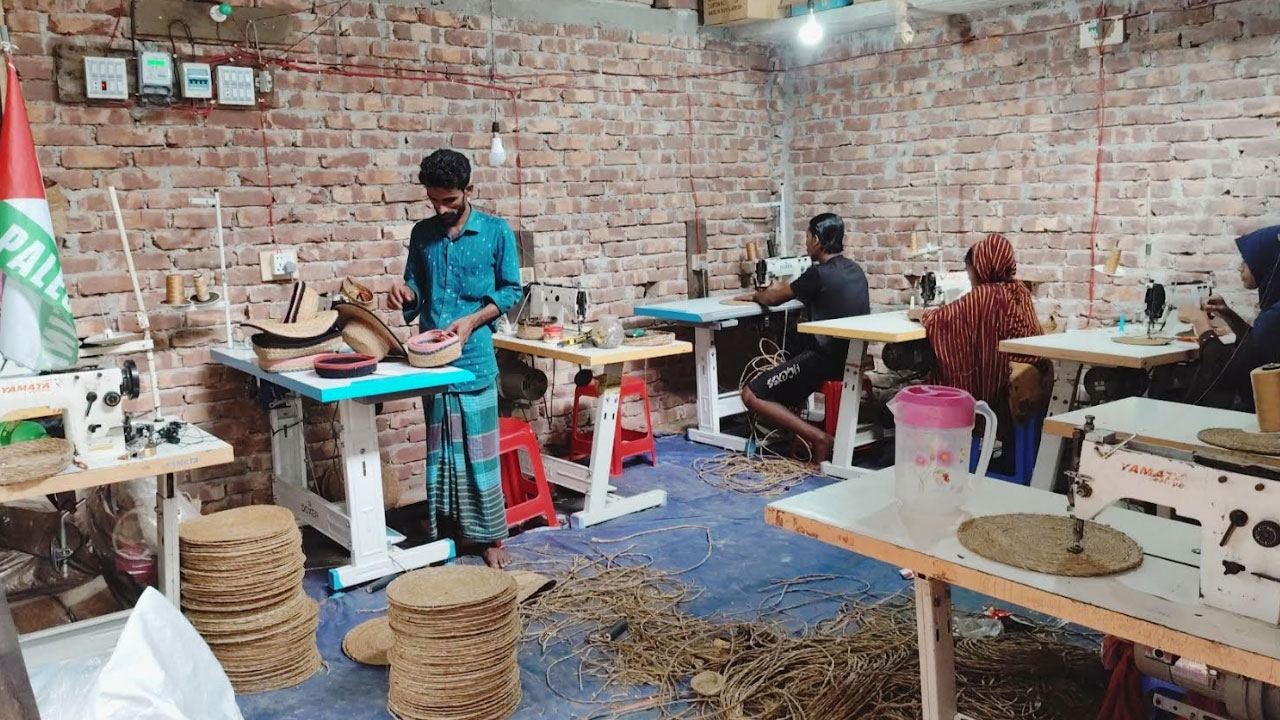 কারখানাটি ঘুরে দেখা যায়, সেখানে ১০টি আধুনিক মেশিনের সাহায্যে কর্মীরা হোগলা পাতার দড়িকে সুতা দিয়ে প্রথমে গোল-লম্বাসহ প্রয়োজনমতো নির্দিষ্ট আকারে সেলাই করেন। এরপর কয়েকটি ধাপ শেষে ঝুঁড়ি,পাপস, প্লেসমেট, ফুলদানি, মাথার ক্যাপসহ অন্যান্য পণ্যকে পূর্ণাঙ্গ রুপ দেওয়া হয়।
