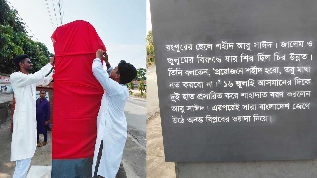 শহীদ আবু সাঈদের স্মরণে স্থাপিত এই ‘স্ট্রিট মেমোরি স্ট্যাম্পে’ লেখা হত্যাকাণ্ড সংক্রান্ত তথ্যে ভুল রয়েছে, এমন অভিযোগ এনেছেন শিক্ষার্থীরা। জুলাই আন্দোলনের মহানায়কের জন্ম তারিখসহ তথ্যগত নানা অসংগতি সামনে এসেছে। বিষয়টি সামাজিক যোগাযোগমাধ্যমে ছড়িয়ে পড়ার পর লাল কাপড় দিয়ে সেটি ঢেকে দিয়েছেন তার সহযোদ্ধা ও বিশ্ববিদ্যালয়ের শিক্ষার্থীরা।