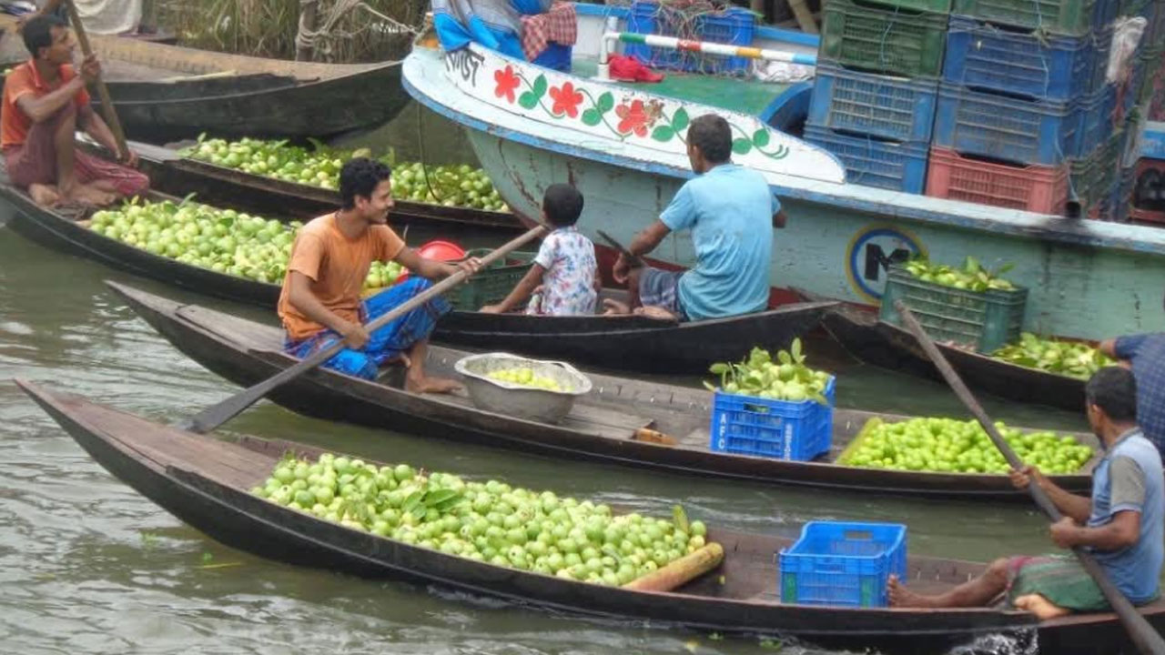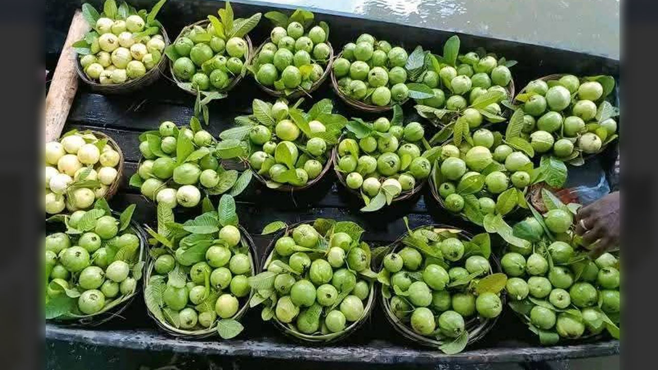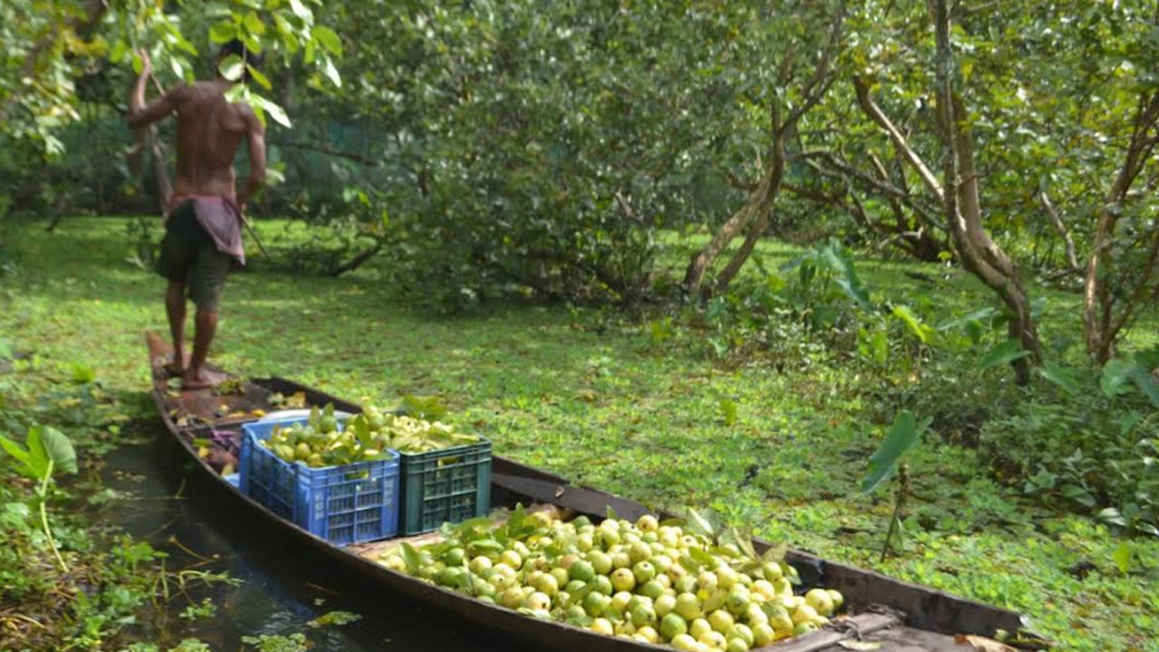 শান্ত স্রোতে ভাসে ডিঙি নৌকা, দুই পাশে পেয়ারা বাগান—যেন এক ভিন্ন জগৎ