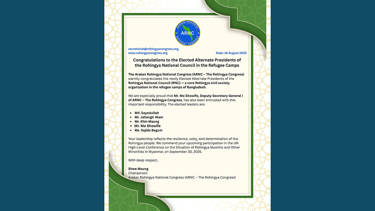 বিবৃতিতে সংগঠনটির সভাপতি ও বুথিডংয়ের সাবেক এমপি শেউয়ে মং- শুভকামনা জানানোর পাশাপাশি আগামী ৩০ সেপ্টেম্বর জাতিসংঘে অনুষ্ঠিতব্য রোহিঙ্গাবিষয়ক উচ্চপর্যায়ের সম্মেলনে নির্বাচিতদের অংশগ্রহণ প্রত্যাশা করেছেন।