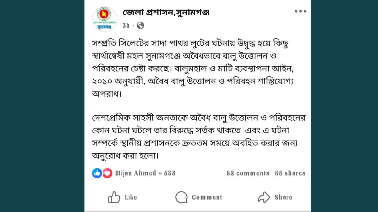জেলা প্রশাসনের ফেসবুক বার্তায় বলা হয়, সম্প্রতি সিলেটের জাফলং এলাকায় সাদা পাথর লুটের ঘটনায় উদ্বুদ্ধ হয়ে কিছু স্বার্থান্বেষী মহল সুনামগঞ্জে অবৈধভাবে বালু উত্তোলন ও পরিবহনের চেষ্টা করছে। অথচ বালুমহাল ও মাটি ব্যবস্থাপনা আইন, ২০১০ অনুযায়ী অনুমোদন ছাড়া বালু উত্তোলন ও পরিবহন শাস্তিযোগ্য অপরাধ। তাই এ ধরনের অপরাধমূলক কর্মকাণ্ডে জড়িতদের বিরুদ্ধে কঠোর আইনানুগ ব্যবস্থা নেওয়া হবে।