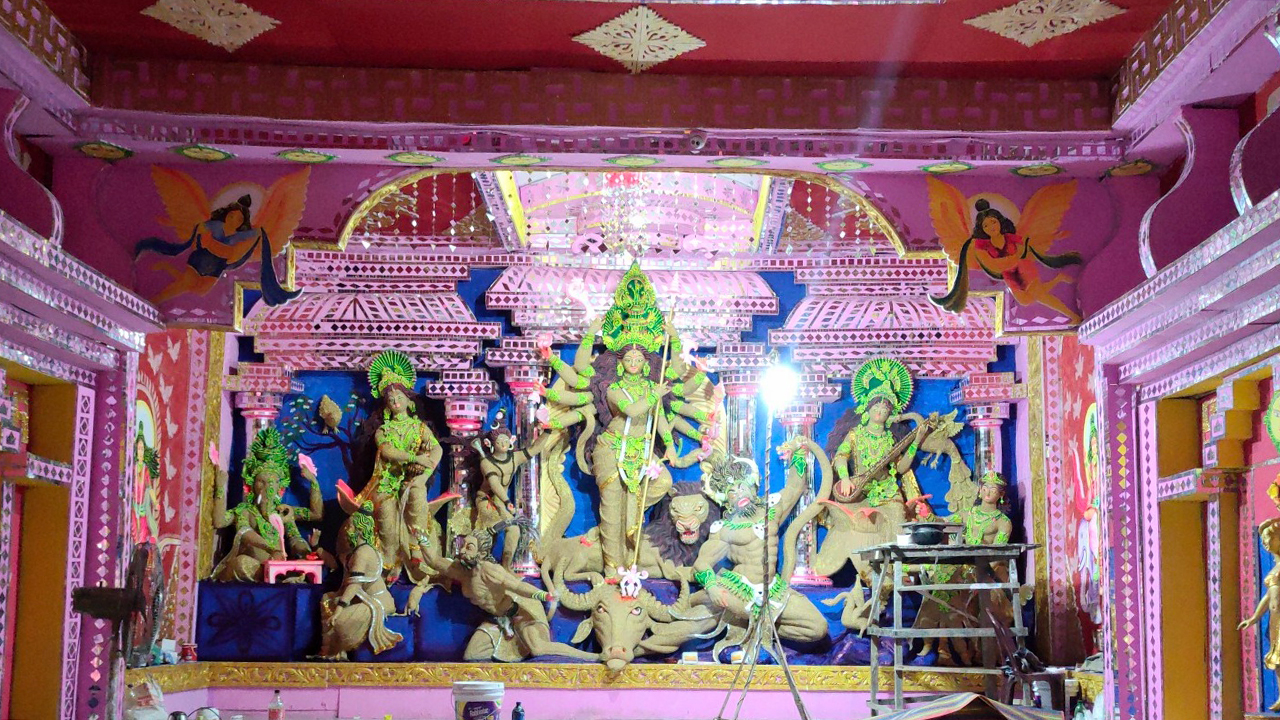 দুর্গার সাজে সোনালি রঙের ধান, নজর কাড়ছে দর্শনার্থীদের