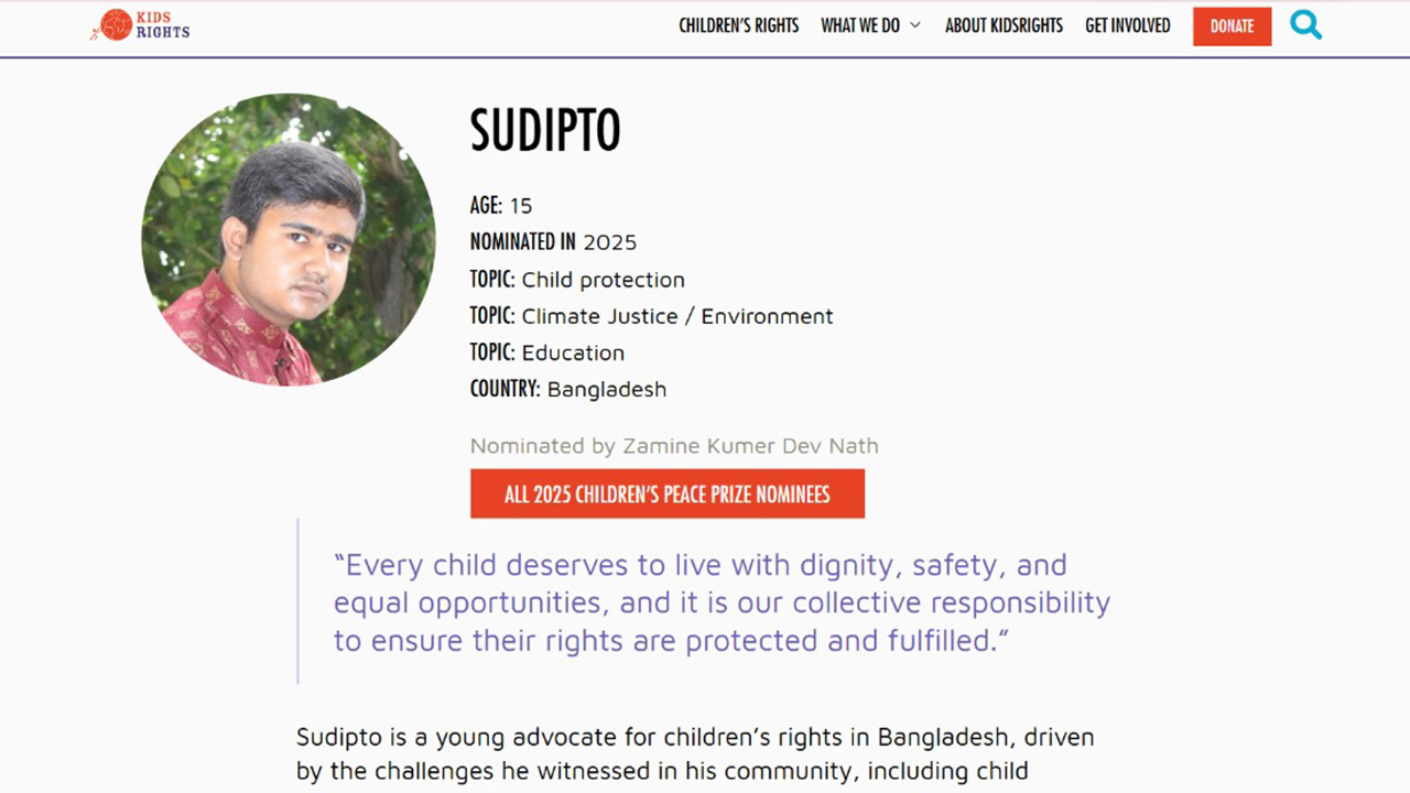 শিশুদের ‘নোবেল’ খ্যাত আন্তর্জাতিক শিশু শান্তি পুরস্কার-২০২৫-এর জন্য মনোনীত হয়েছেন সাতক্ষীরার তরুণ সমাজকর্মী সুদীপ্ত দেবনাথ (১৫)। তিনি শিশু সুরক্ষা, জলবায়ু ন্যায়বিচার ও শিক্ষার প্রসারে কাজের স্বীকৃতিস্বরূপ এই মনোনয়ন পেয়েছেন।