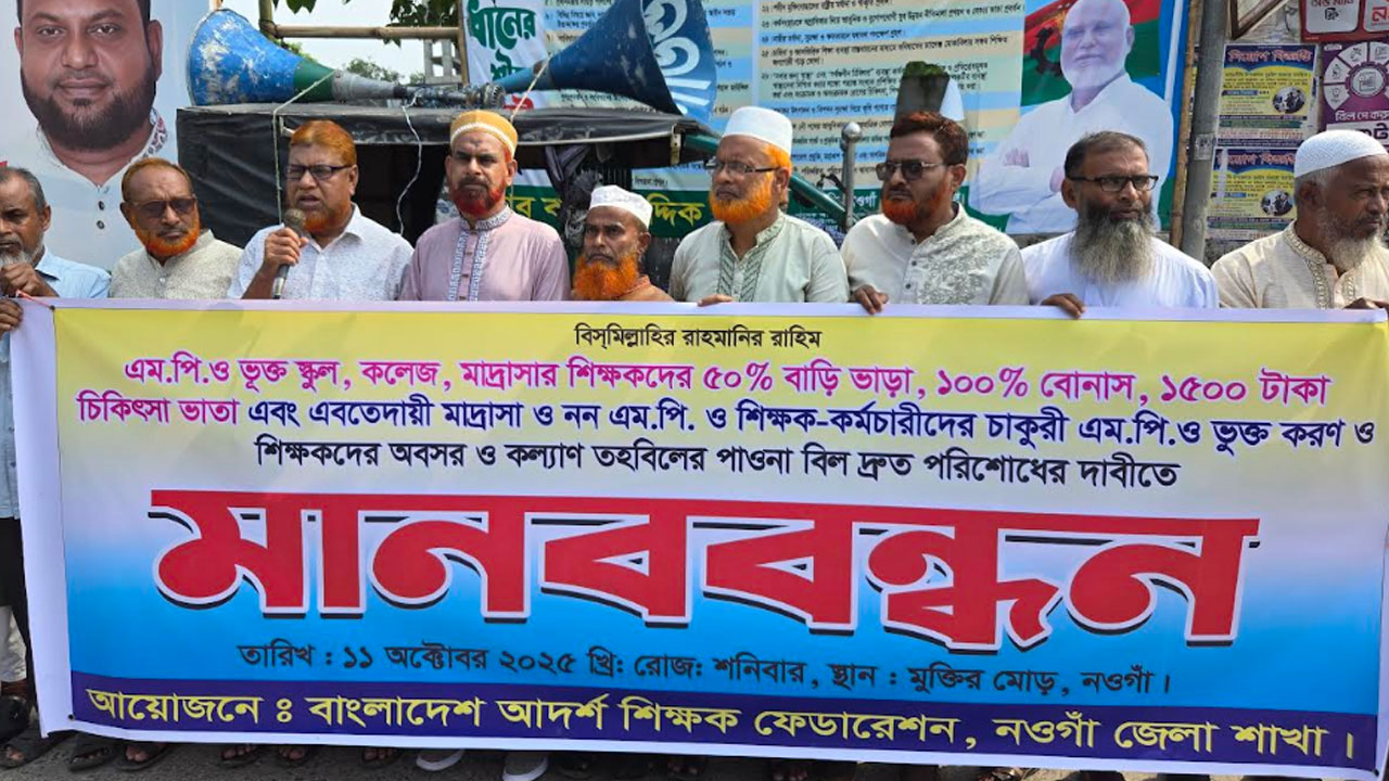 শনিবার (১১ অক্টোবর) বেলা ১১টার দিকে শহরের মুক্তির মোড় কেন্দ্রীয় শহীদ মিনারের সামনে দাঁড়িয়ে ঘণ্টাব্যাপী এ কর্মসূচি পালন করেন তারা। বাংলাদেশ আদর্শ শিক্ষক ফেডারেশন নওগাঁ জেলা শাখার ব্যানারে এ মানববন্ধন কর্মসূচি অনুষ্ঠিত হয়।