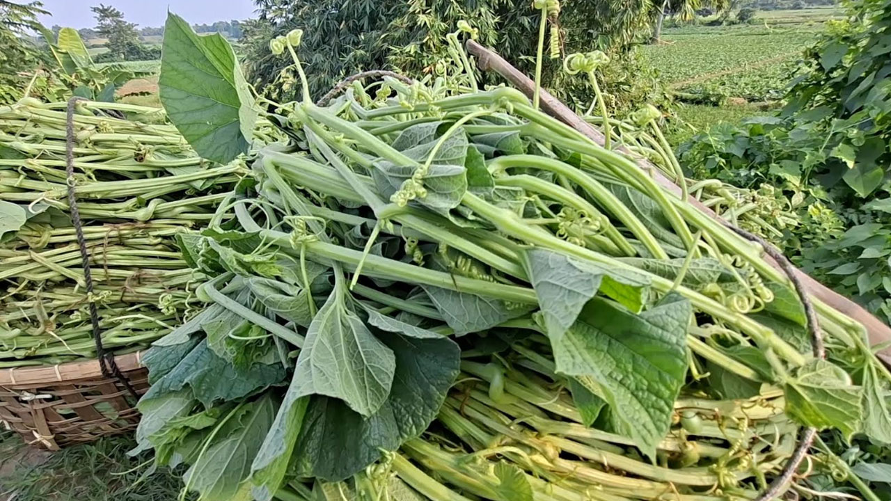 ছোট থেকে মাঝারি আকারের এসব লাউগাছ বেয়ে ওঠার আগেই ডগা কেটে ফেলা হচ্ছে। তাই প্রয়োজন হচ্ছে না বাঁশ বা বাঁশের তৈরি মাচার। শুধু নামে মাত্র সার-ওষুধে বছরের একটা অংশ জুড়ে থাকে লাউ গাছের চাষ। লতা বেয়ে ৩-৫ ফুট আকার ধারণ করার পর ডগার গোড়ায় কেটে ফেলেন কৃষক। সেসব গোড়া থেকে নতুন ডগা বের হয়। এসব ডগা আবার ৩-৫ ফুট লম্বা হতে সময় নেয় ১০-১২ দিন। আবার সেই ডগাগুলো কেটে ফেলা হয়। এভাবে একবার চারা লাগানোর পর ৩-৪ বার ডগা কেটে সেই ডগাগুলোই আঁটি বেঁধে বাজারে পাঠাচ্ছেন কৃষকরা।