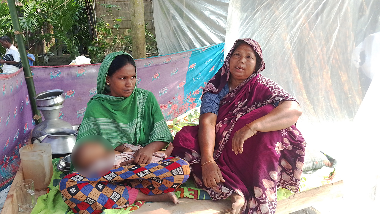 নাছিমা বেওয়া (৬০) বলেন, ‘নদীর ভাঙনে বাড়ি ভিটা সব গেইছে, একটা ঘর মানুষের জায়গা নিয়ে আছি। টাকা নাই ঘর এখনো তুলতে পারি নাই। আমার শাশুরিসহ ৫ জন সংসারে আছে। টিনের ঘরটি মাটিতে রেখে চকিতে বিছনা করে আছি। ভয় লাগে কখন জানি পোকামাকর কামড়ায়।’