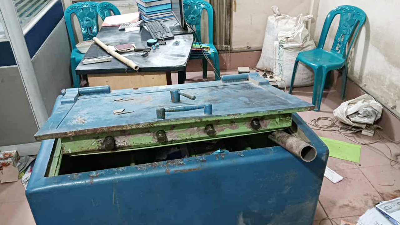 সরেজমিনে দেখা গেছে, অফিসকক্ষের সব ড্রয়ার খোলা অবস্থায় পড়ে আছে, মেঝেতে ছড়িয়ে ছিটিয়ে রয়েছে কাগজপত্র। মেঝেতে পড়ে আছে ভাঙা সিন্দুক। সেখানে বাঁশের লাঠি ও লোহার পাইপও দেখা যায়।