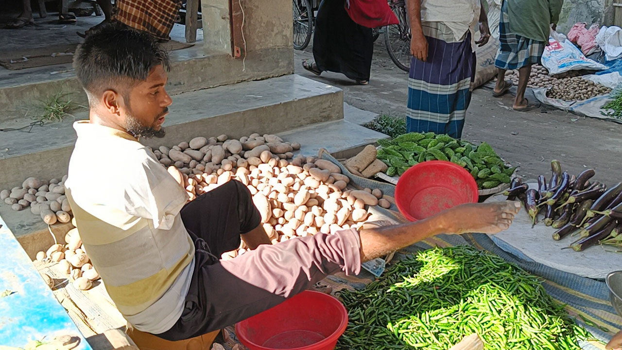 গত ২১ অক্টোবর দুপুরে নগরকান্দার রসুলপুর বাজারে গিয়ে দেখা যায়, আলু, পটল, পেঁয়াজ, রসুন, আদা, শসা,বেগুনসহ বিভিন্ন কাঁচামাল বিক্রি করছেন জসীম। তার দোকানে ক্রেতাদের ভিড়। পা দিয়ে পণ্য মেপে, তা ব্যাগে ভরে, খুচরা টাকা ফেরত দিয়ে টাকা গুনে নিতে ব্যস্ত সময় পার করছে সে। কোনো দিকে মন দেওয়ার কোনো সুযোগ নেই তার।